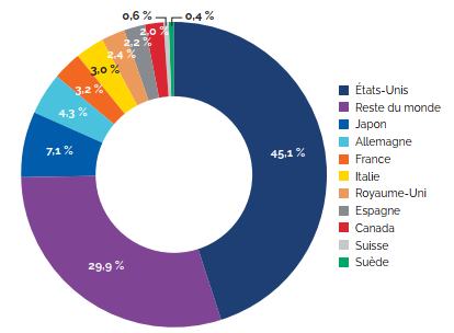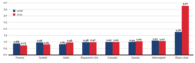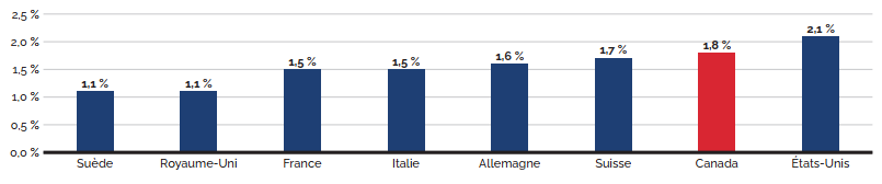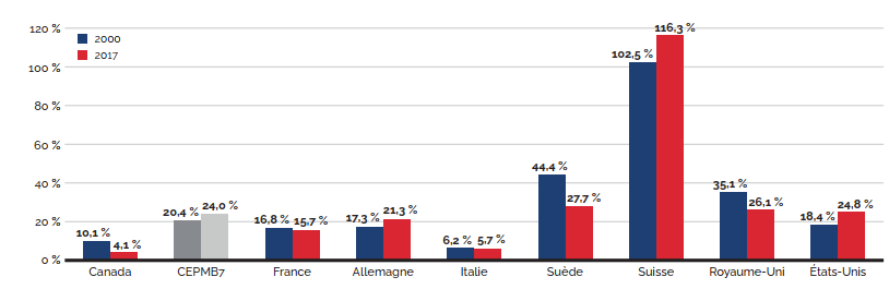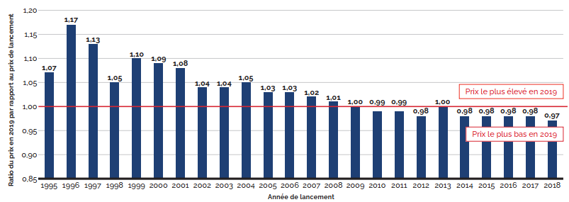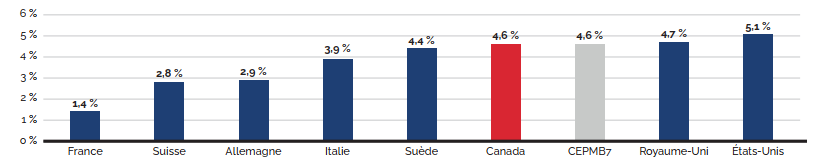 Les prix courants des médicaments brevetés au Canada sont les quatrièmes plus élevés des pays membres de l’Organisation de coopération et de développement économiques (OCDE), toujours loin derrière les États-Unis, mais juste un peu en deçà de ceux de l’Allemagne et de la Suisse. À l’inverse, le ratio de recherche et développement par rapport aux ventes réalisées par les titulaires de brevets pharmaceutiques au Canada poursuit son déclin depuis des décennies et se situe maintenant à 3,9 %, son niveau le plus bas depuis que le CEPMB a commencé à faire rapport sur les tendances pharmaceutiques dans les années 1980.