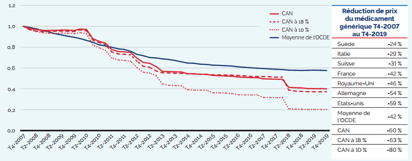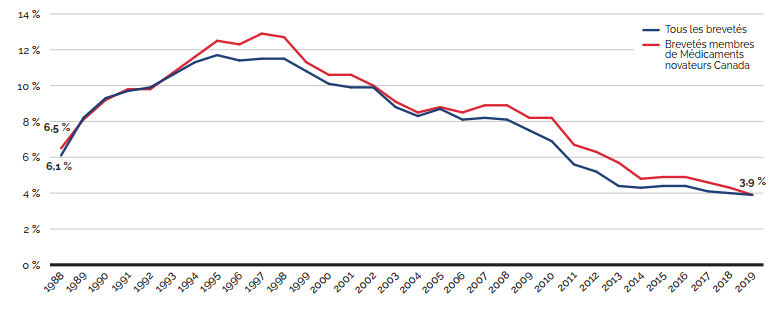 - 3,9 % pour tous les brevetés membres de Médicaments novateurs Canada, une diminution par rapport à 4,3 % en 2018.