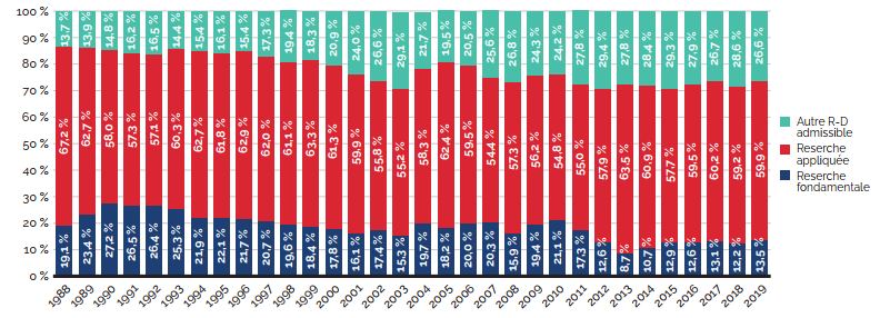 Remarque : Pour chaque province et territoire, la part de chaque catégorie représente le pourcentage des dépenses totales de R-D pour la province ou le territoire donné (ou à l’échelle nationale pour l’ensemble des dépenses de R-D au Canada).