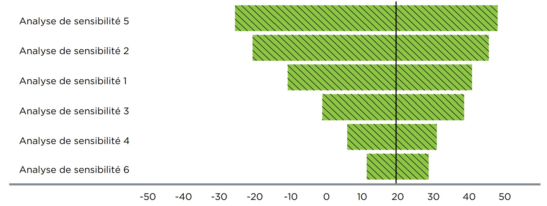De l’information est ajoutée à l’analyse des scénarios afin d’aviser les décideurs du degré de sensibilité de la structure du modèle par rapport aux hypothèses formulées. |