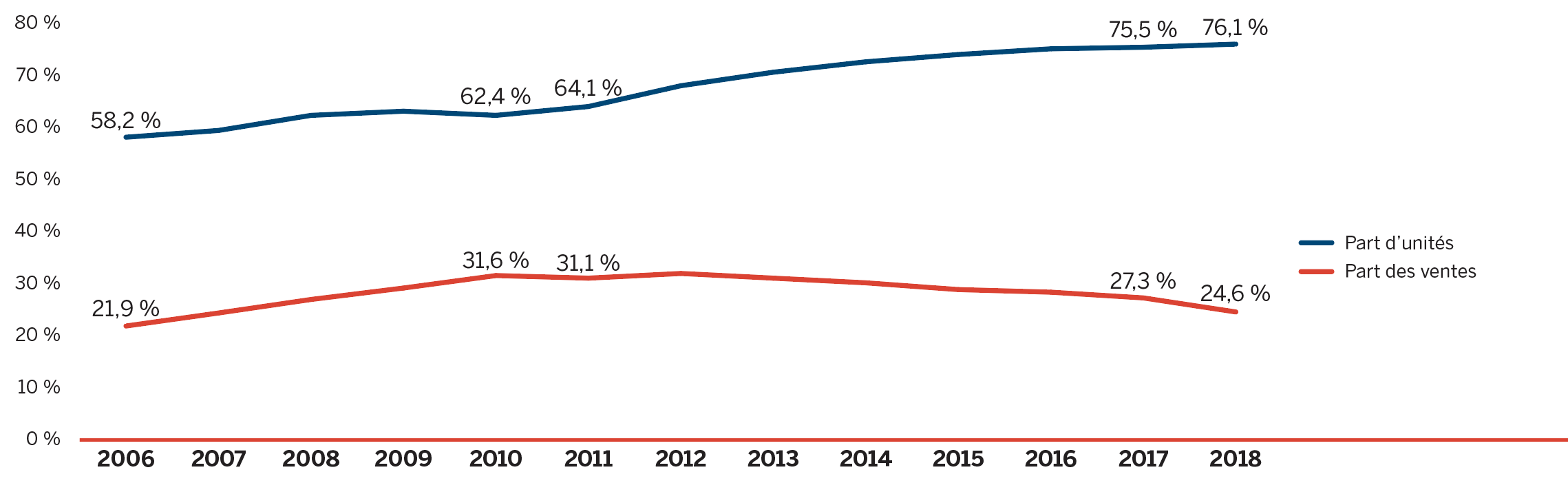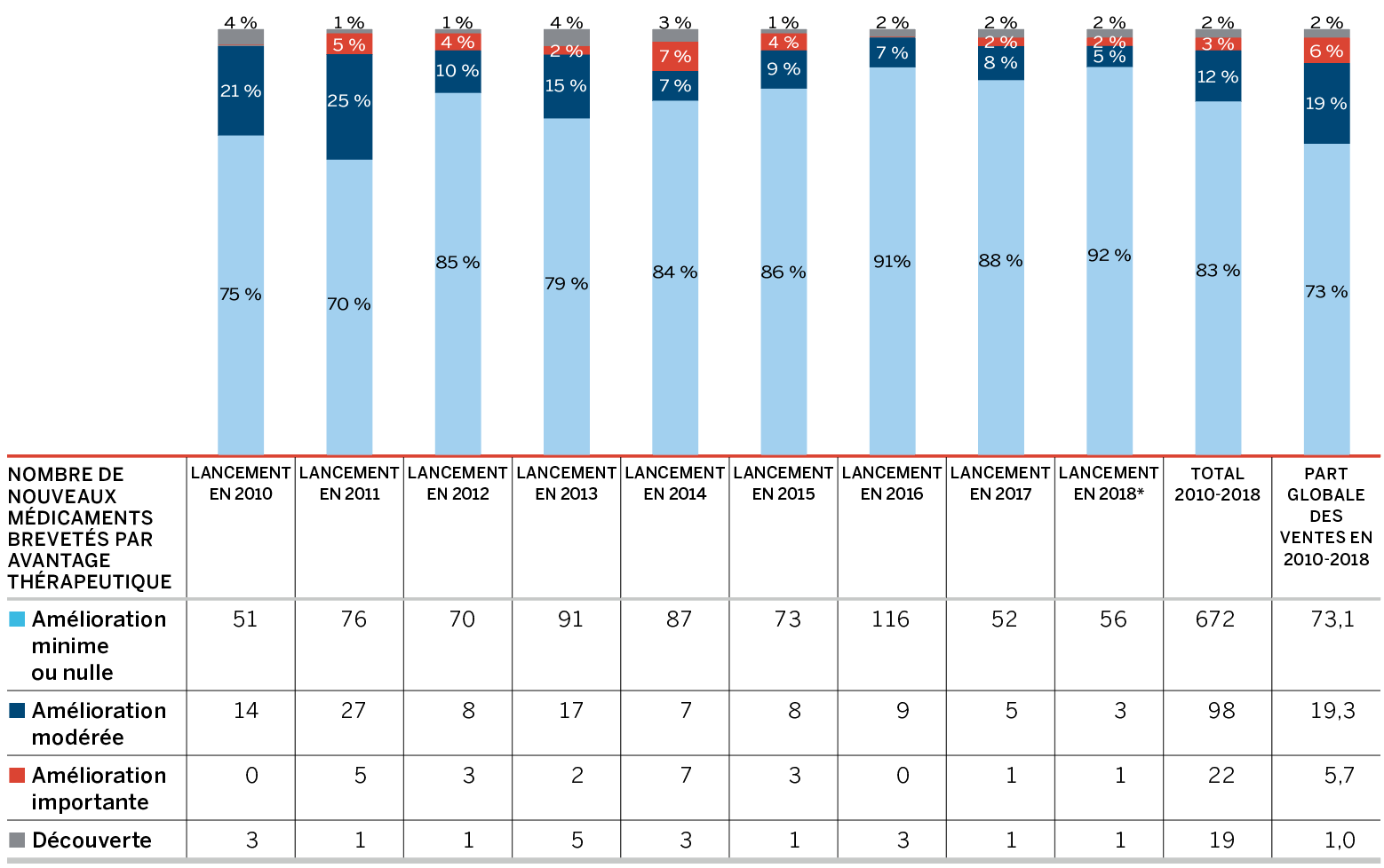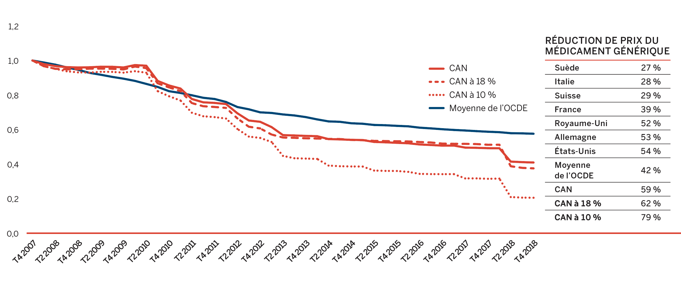 - Les médicaments brevetés représentaient 59,0 % du total des ventes de médicaments au Canada, soit une diminution par rapport à 61,5 % en 2017.