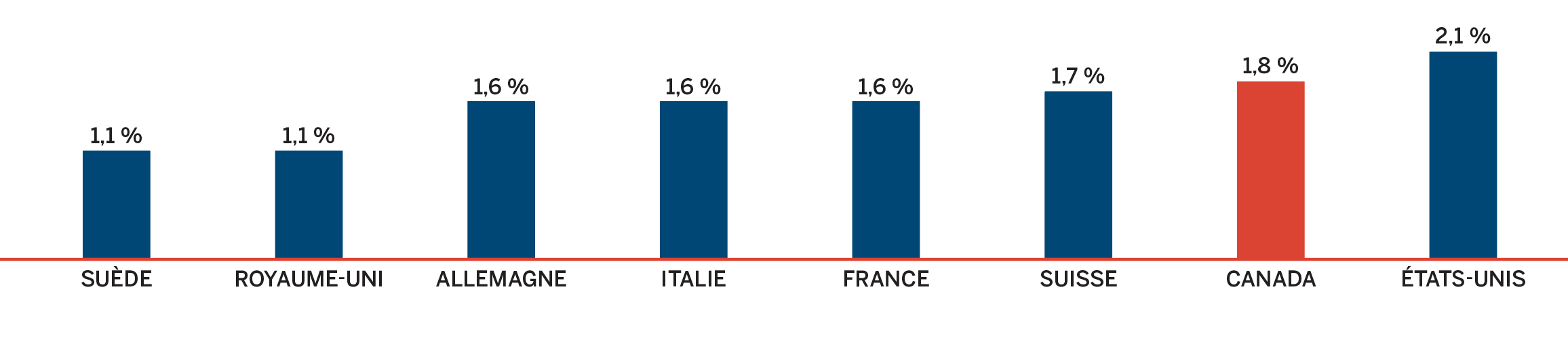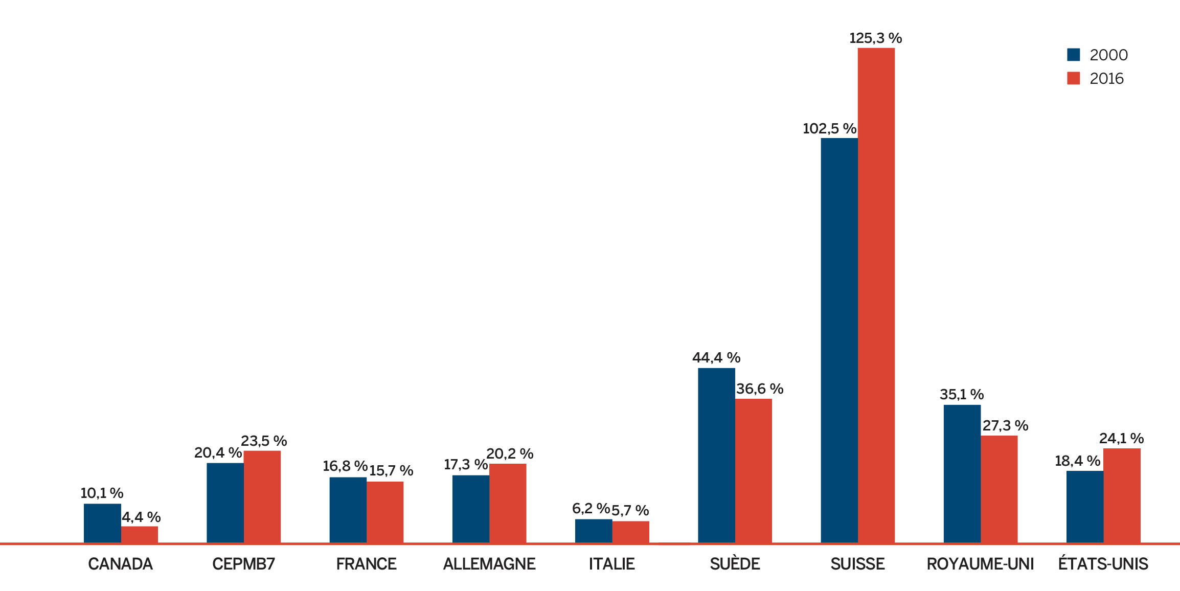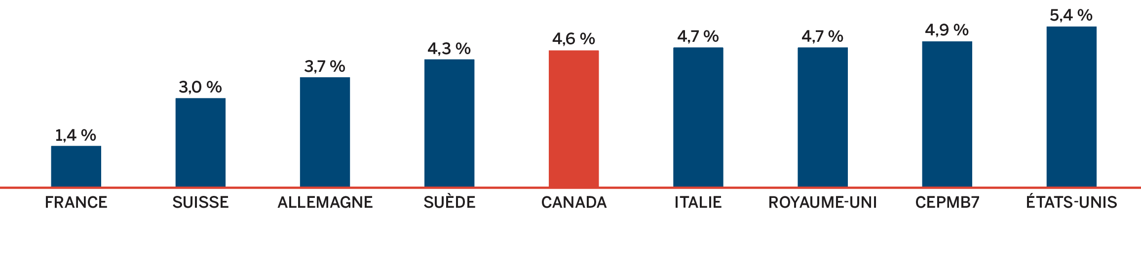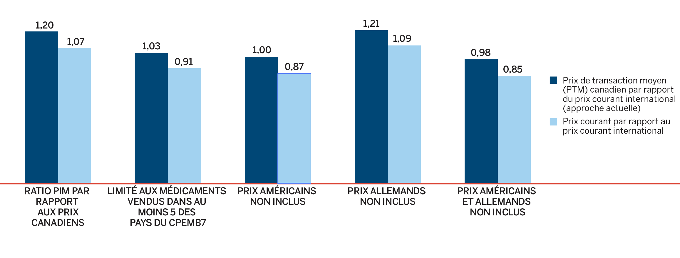 - Les prix au Canada se situaient au quatrième rang des prix les plus élevés parmi les sept pays de comparaison du CEPMB, étant inférieurs aux prix en Suisse, en Allemagne et aux États-Unis.