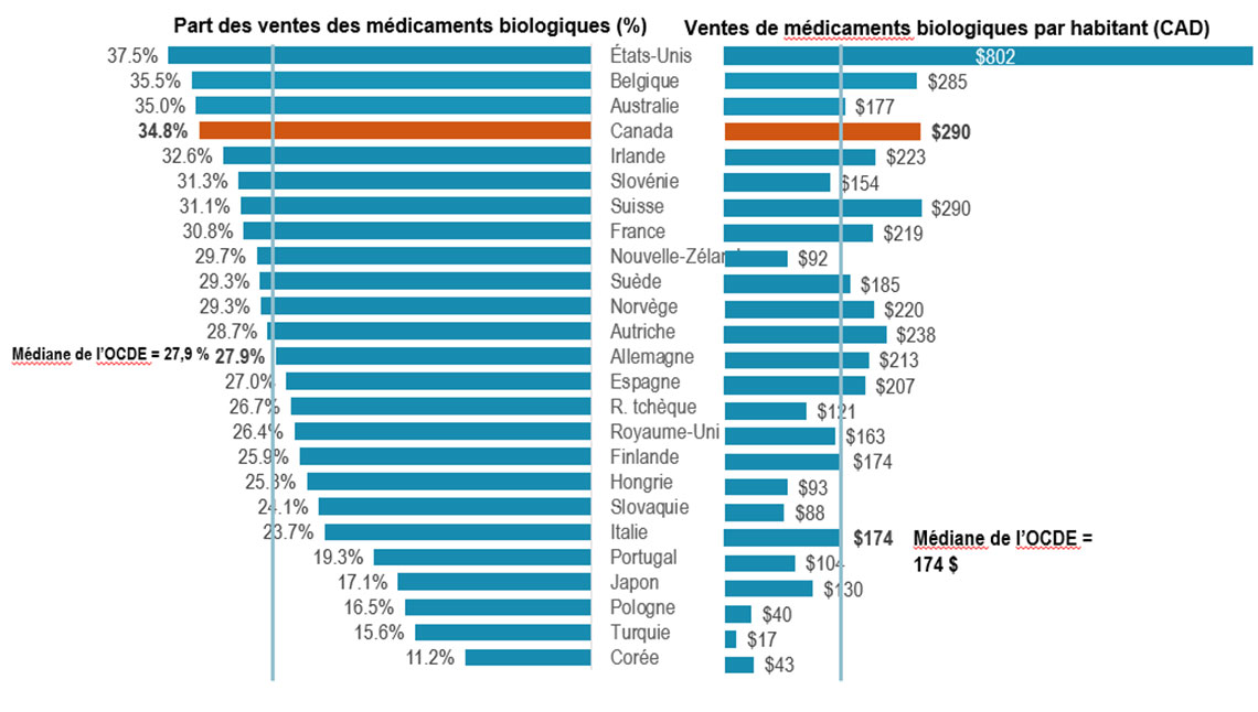 - En 2021, les médicaments biologiques représentaient 34,8 % des ventes de produits pharmaceutiques au Canada, soit la quatrième part la plus élevée de l’OCDE et dépassant la médiane de 27,9 %.