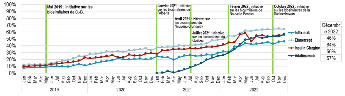 Un graphique avec ligne et marqueurs montre l'adoption de biosimilaires d'infliximab, d'etanercept, d'insuline glargine et d'adalimumab en tant que part de toutes les unités vendues de leurs médicaments biologiques respectifs en Colombie-Britannique de janvier 2019 à décembre 2022. Les résultats sont donnés mensuellement pour cette période. La phase I de l'initiative sur les biosimilaires pour Enbrel, Remicade et Lantus a commencé en mai 2019, suivie de la phase II pour Remicade,qui a commencé en septembre 2019. La phase IV d'Humira a commencé en avril 2021.