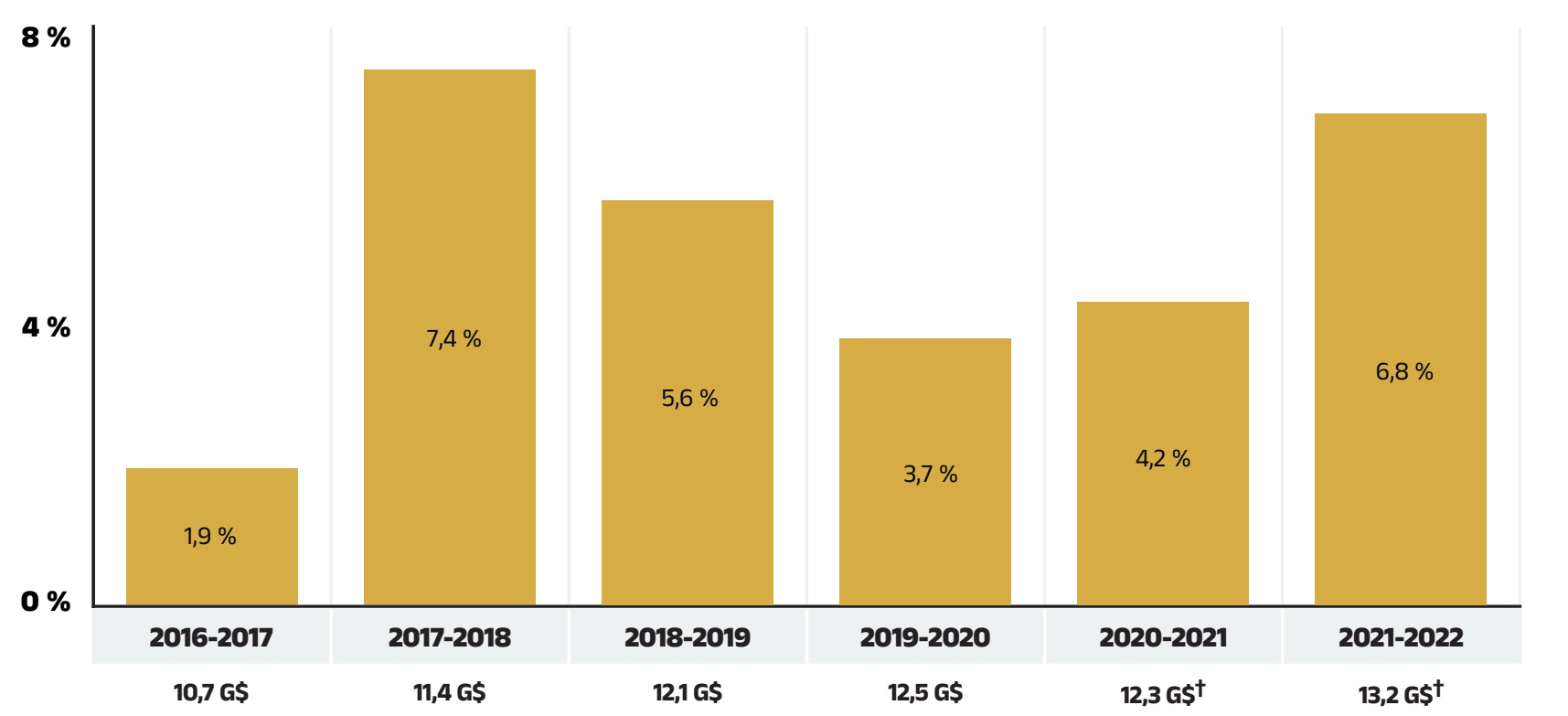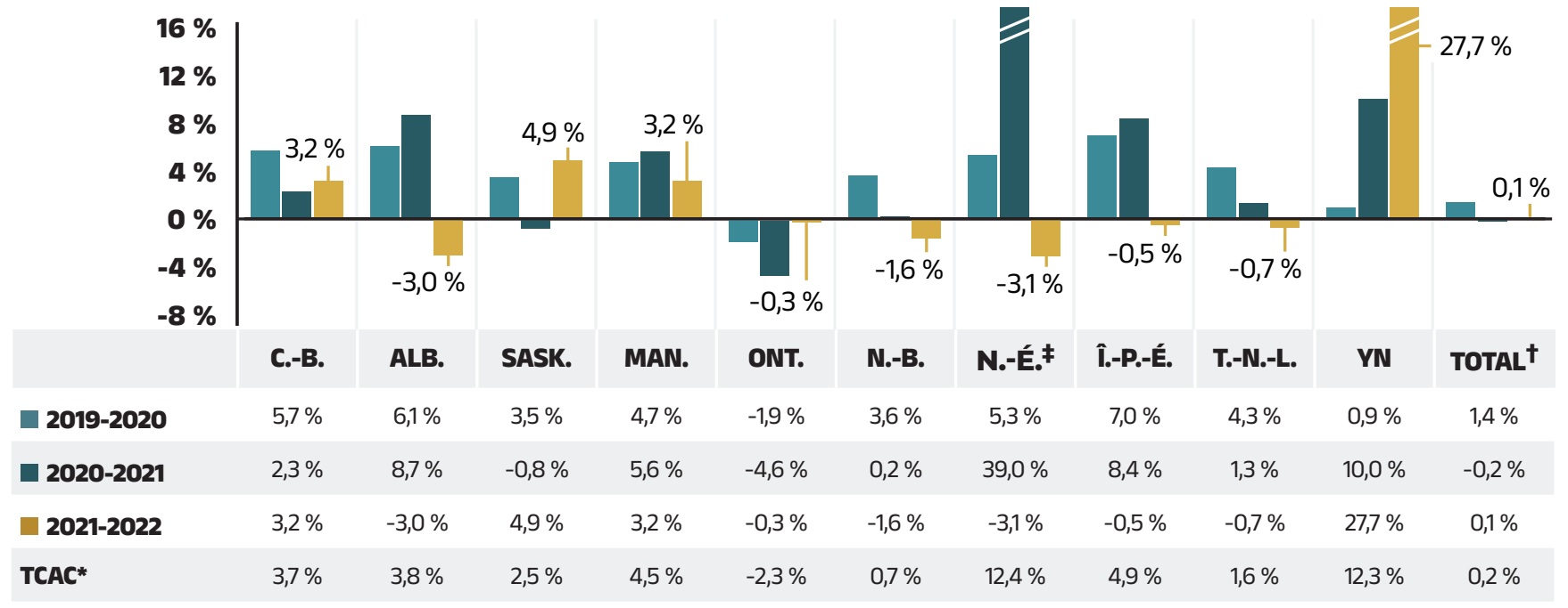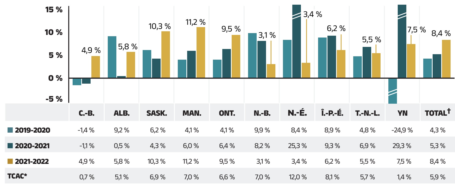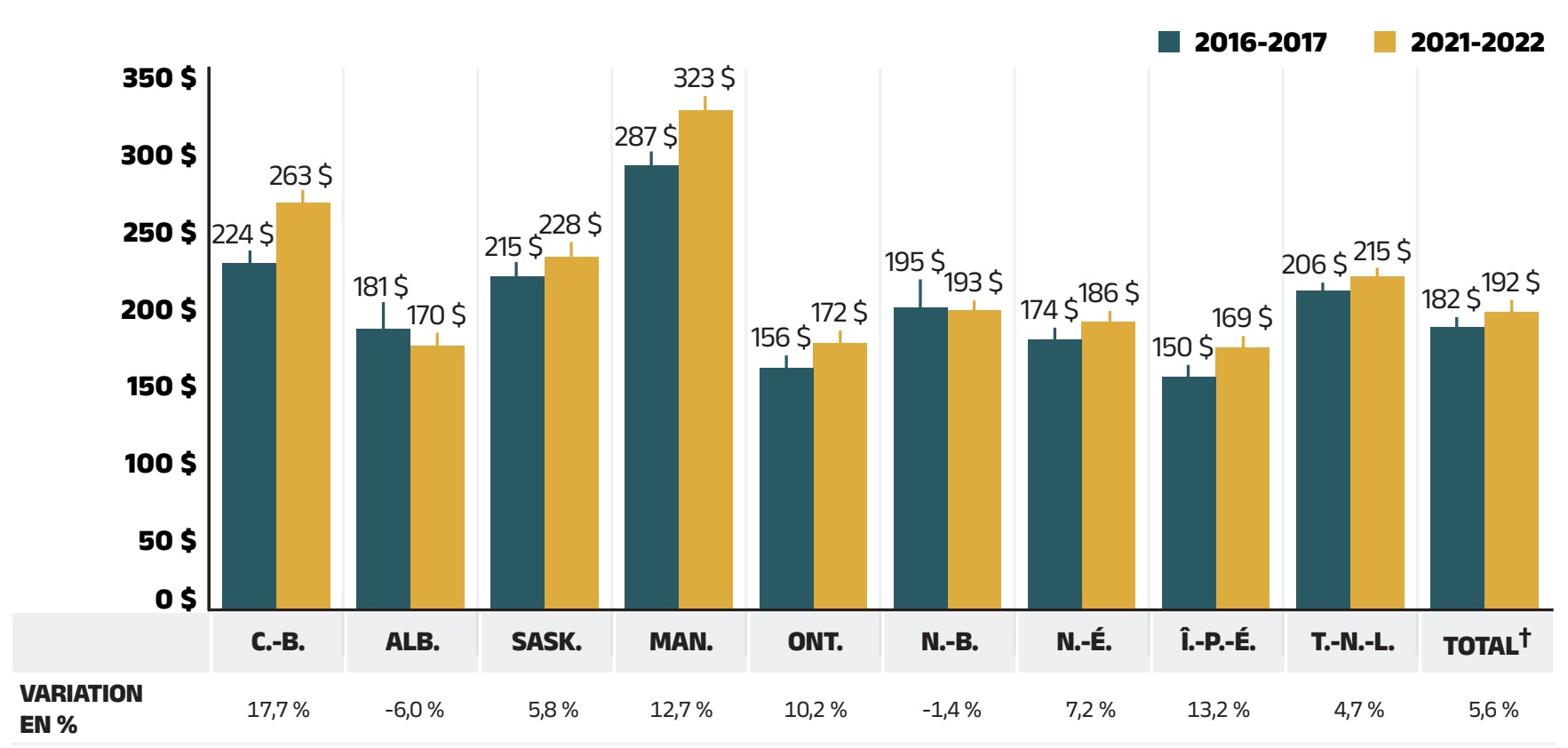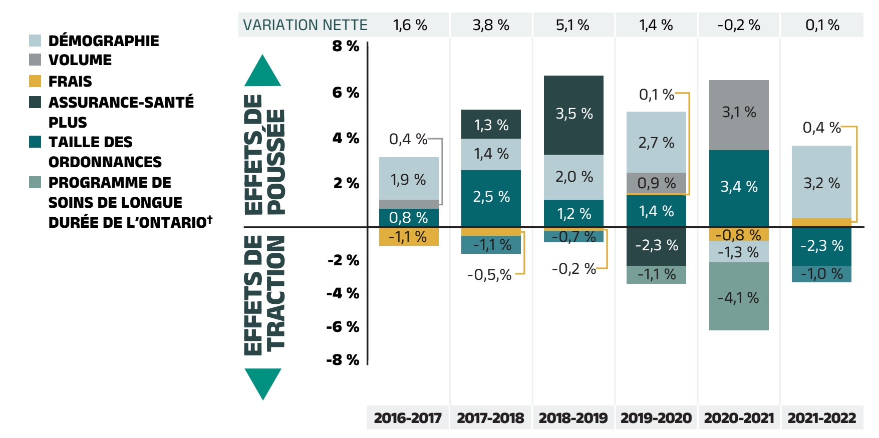 - Entre 2016‑2017 et 2021‑2022, les dépenses totales en médicaments d’ordonnance des régimes publics d’assurance‑médicaments du Canada ont augmenté de 3,1 milliards de dollars, atteignant un taux de croissance annuel composé de 4,9 %.