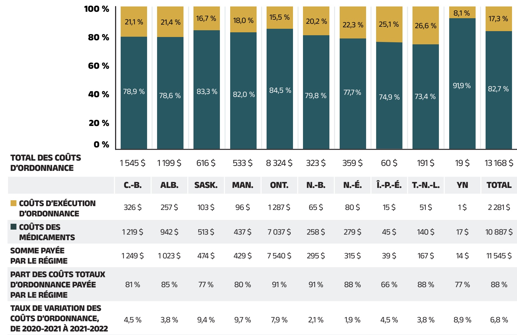 - Les coûts des médicaments, qui représentent 83 % des dépenses en médicaments d’ordonnance, ont connu une hausse de 8,4 % de 2020‑2021 à 2021‑2022, tandis que les coûts d’exécution d’ordonnance, qui représentent les 17 % restants des dépenses, ont augmenté de 0,1 %.
