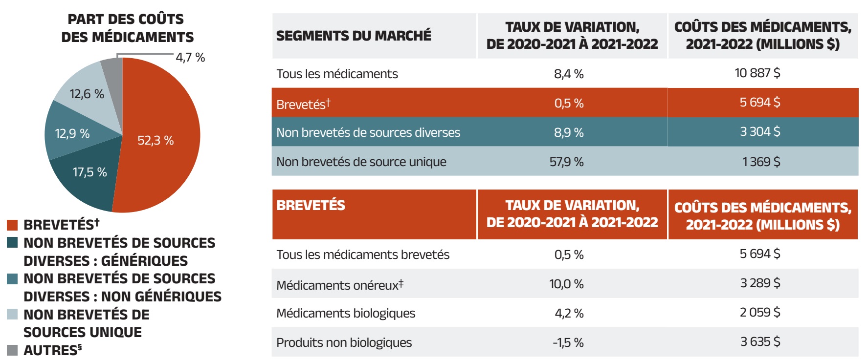 - Le segment du marché des médicaments brevetés, qui représentait 52,3 % des coûts des médicaments des régimes publics en 2021‑2022, a connu une croissance modeste de 0,5 %, avec une hausse considérable de 10,0 % des coûts des médicaments dont les coûts de traitement annuels dépassaient 10 000 dollars.
