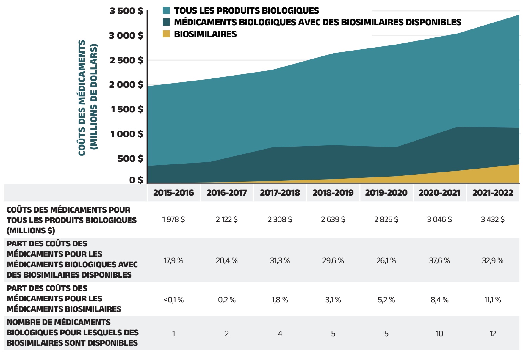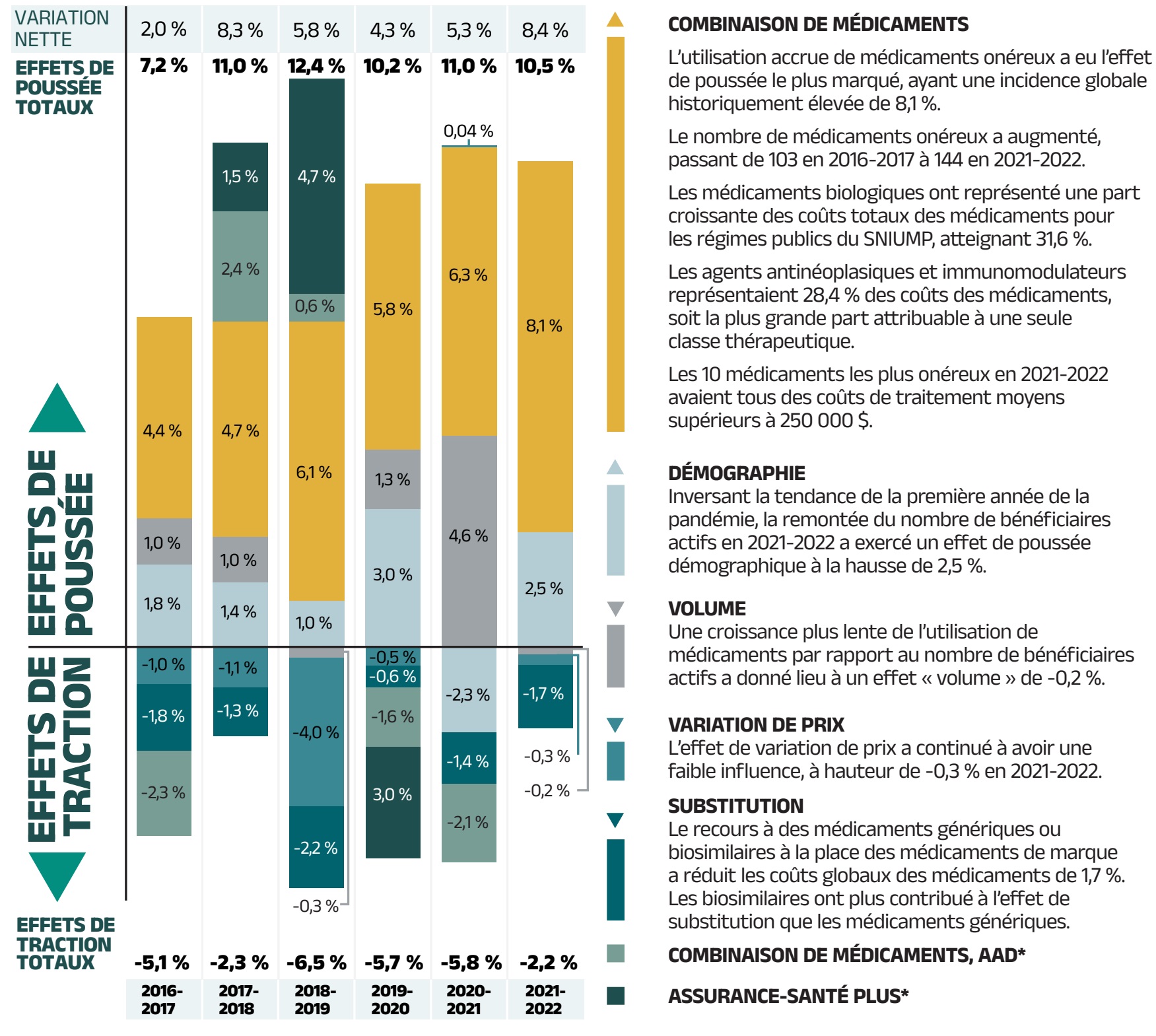 La croissance des coûts des médicaments pour les régimes publics du SNIUMP en 2021‑2022 est principalement attribuable à une augmentation soutenue de l’utilisation de médicaments plus onéreux et à des mesures d’économie limitées.