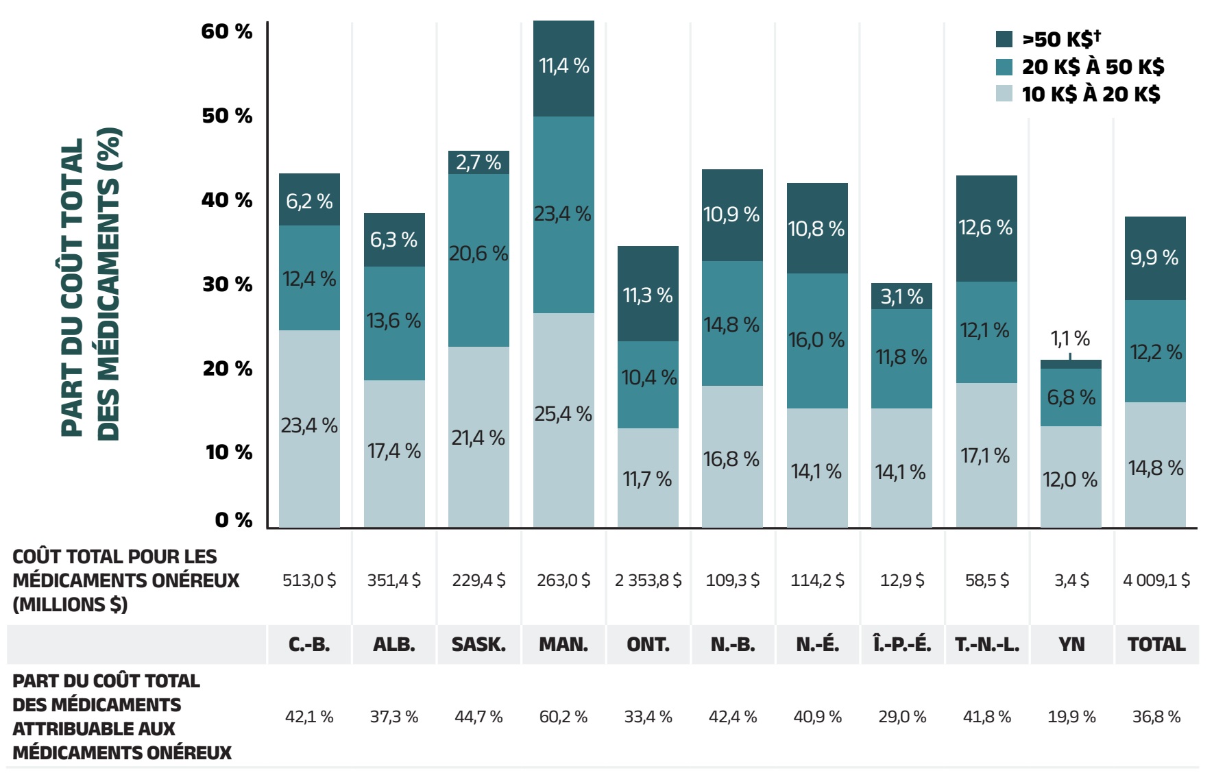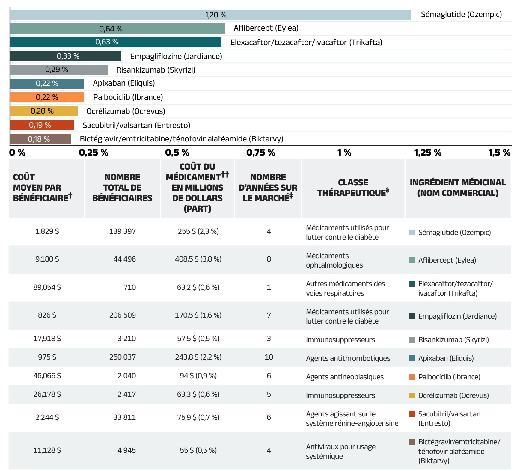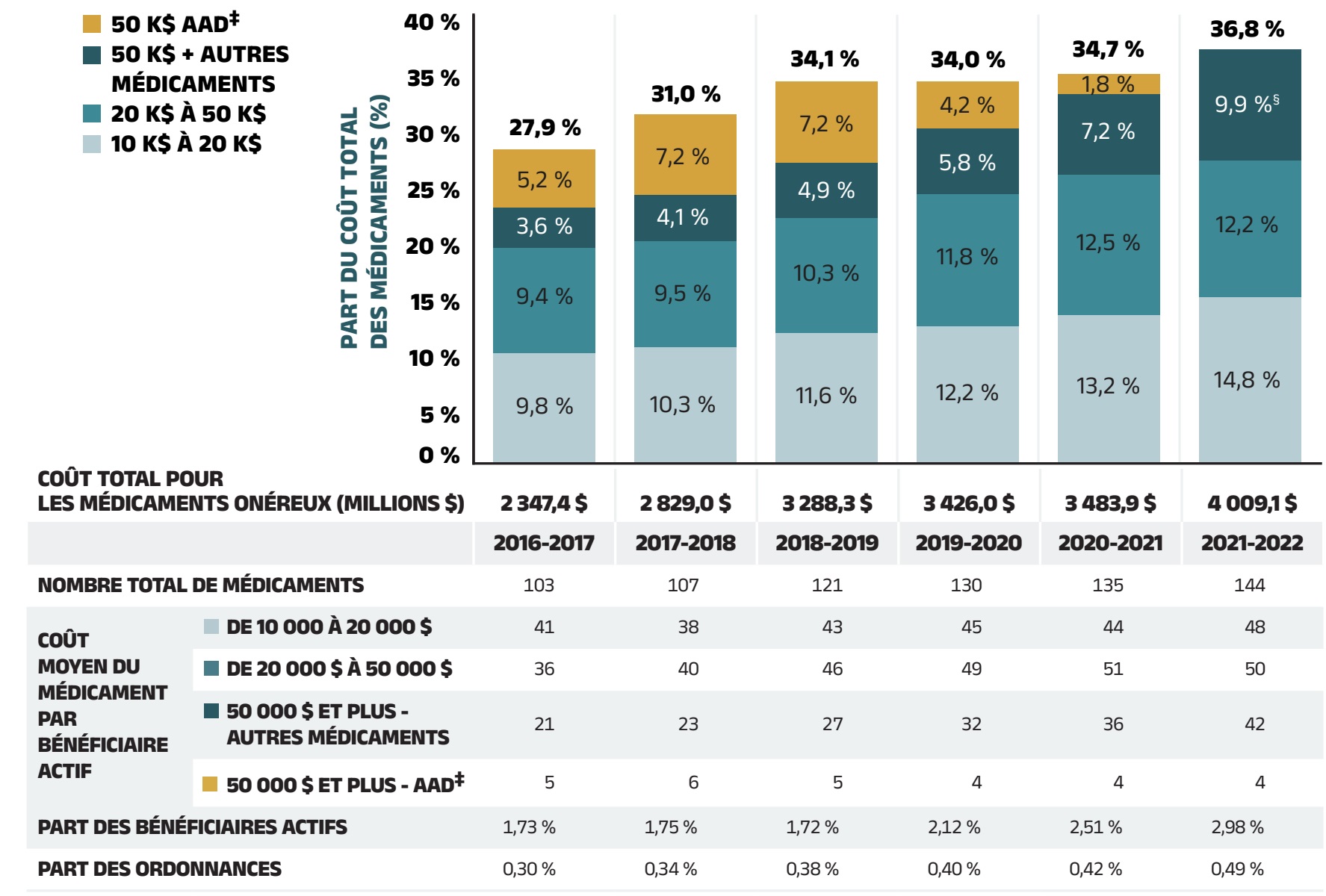 - En 2021‑2022, 7,5 % des bénéficiaires des régimes publics d’assurance‑médicaments ont compté pour plus de 60 % des coûts totaux des médicaments. Les médicaments onéreux, utilisés par 3 % des bénéficiaires, représentaient 36,8 % des coûts.