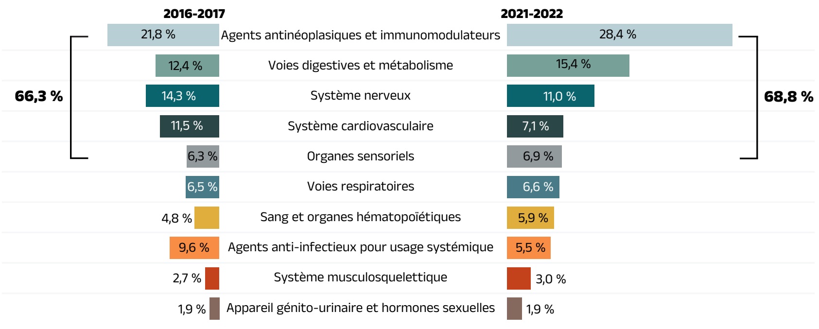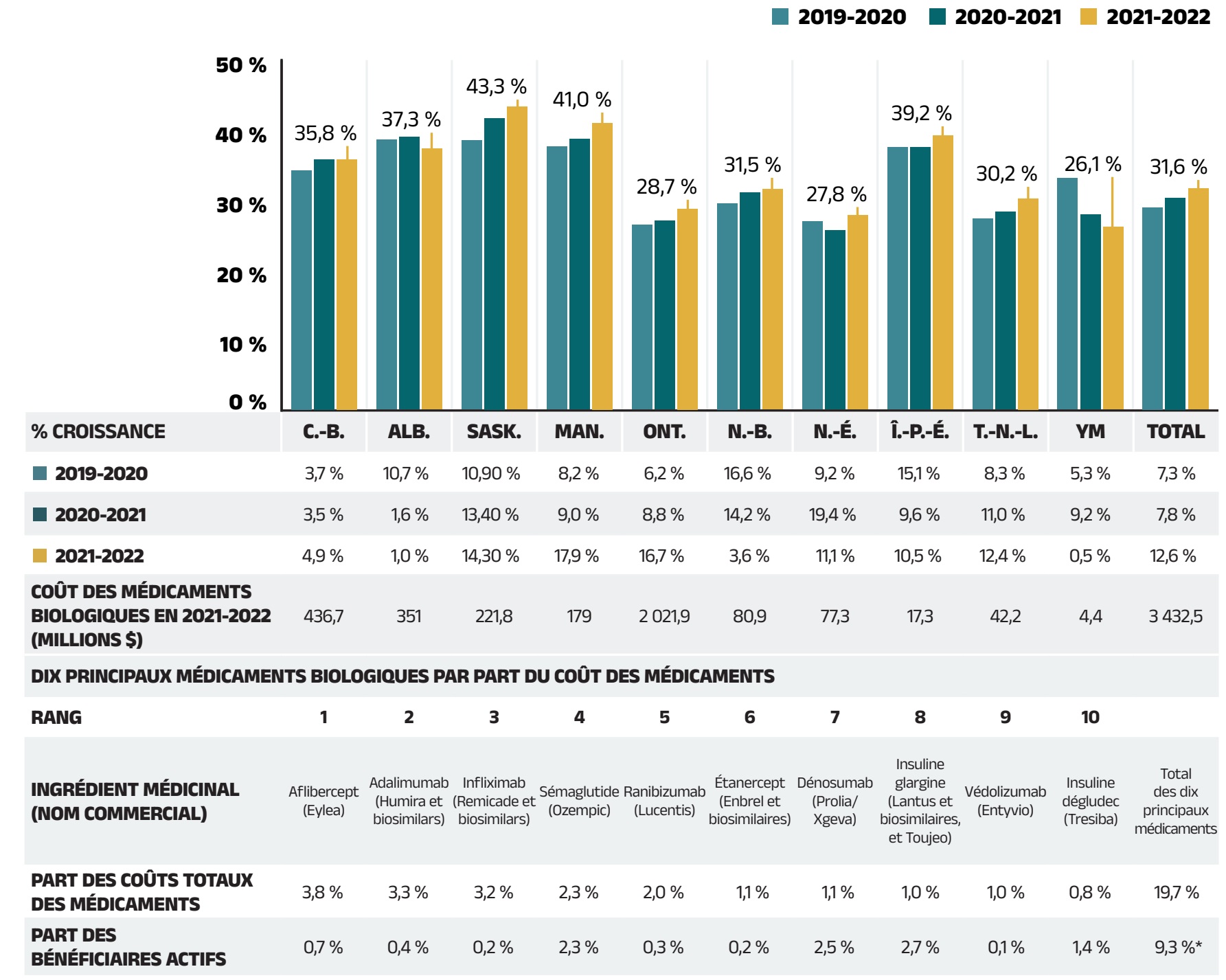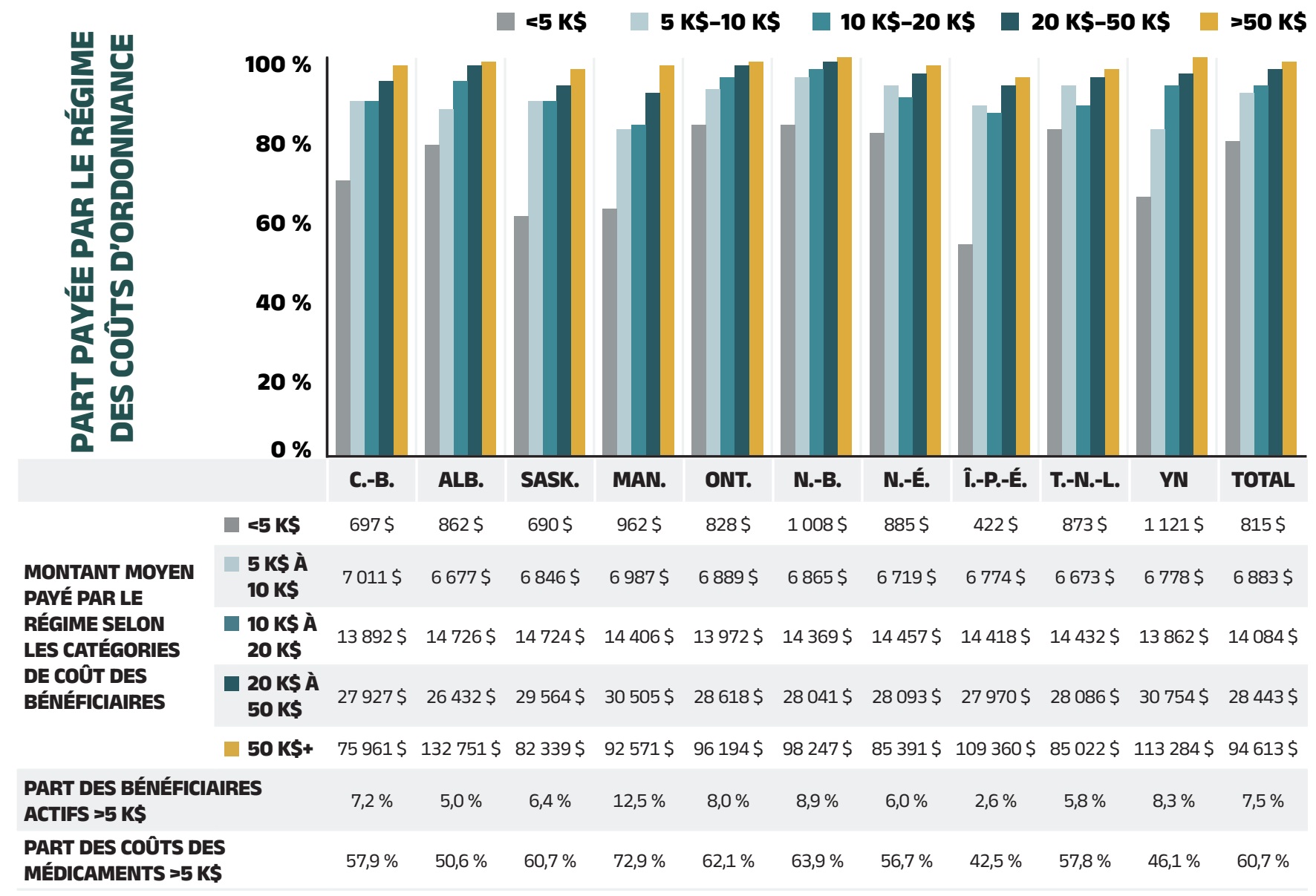 - En 2021‑2022, 7,5 % des bénéficiaires des régimes publics d’assurance‑médicaments ont compté pour plus de 60 % des coûts totaux des médicaments. Les médicaments onéreux, utilisés par 3 % des bénéficiaires, représentaient 36,8 % des coûts.