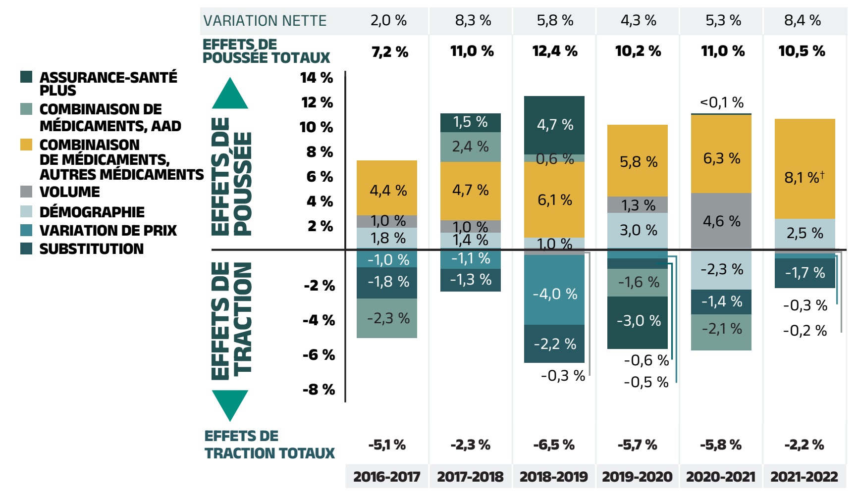 - L’utilisation accrue de médicaments plus onéreux demeure l’inducteur ayant eu l’effet le plus marqué en 2021‑2022, entraînant une poussée à la hausse de 8,1 % sur les coûts, tandis que la diminution du recours aux antiviraux à action directe (AAD) a été négligeable.