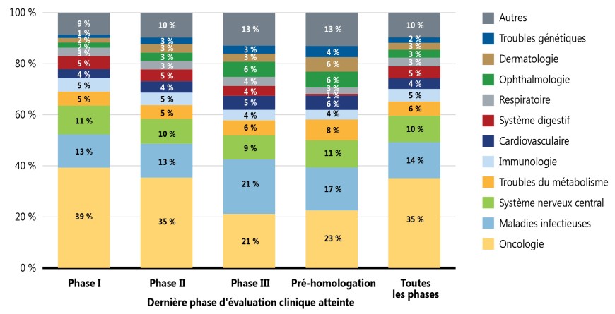 - L’oncologie a continué de dominer l’éventail thérapeutique en 2021, les traitements contre le cancer représentant plus du tiers (35 %) des médicaments à toutes les phases des essais cliniques. Les traitements contre les maladies infectieuses ont occupé la deuxième place, représentant 14 % des médicaments émergents. Ces résultats s’expliquent par les mesures d’intervention rapide prises pour lutter contre la pandémie de COVID‑19.