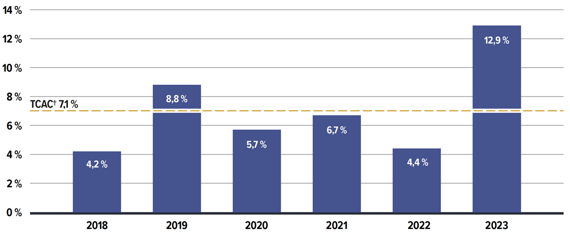 | Variation nette | 0,6 % | 9,0 % | 5,4 % | 4,0 % | 4,5 % | 14,1 % |