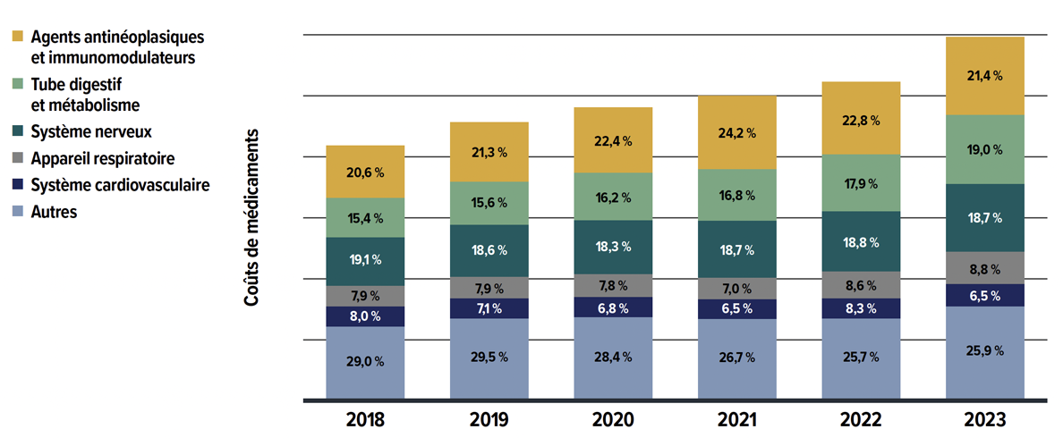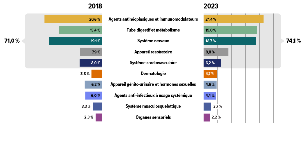 | Agents antinéoplasiques et immunomodulateurs | 20,6 % | 21,3 % | 22,4 % | 24,2 % | 22,8 % | 21,4 % |
