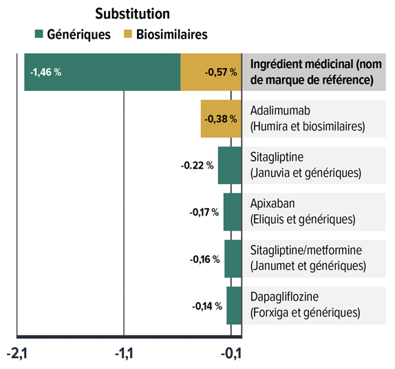 - Les mesures visant à atténuer les coûts, y compris les substitutions par un médicament générique ou un produit biosimilaire et les réductions de prix, ont permis de réduire les coûts de 1 % à 4 % par année. En 2023, l’effet « substitution » a pris de l’ampleur, entraînant une baisse des coûts (-2,0 %), tandis que l’effet « variation de prix » a eu une incidence minime (0,5 %).