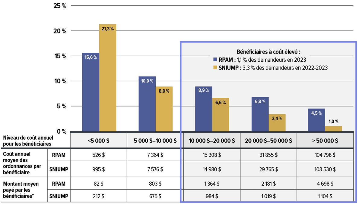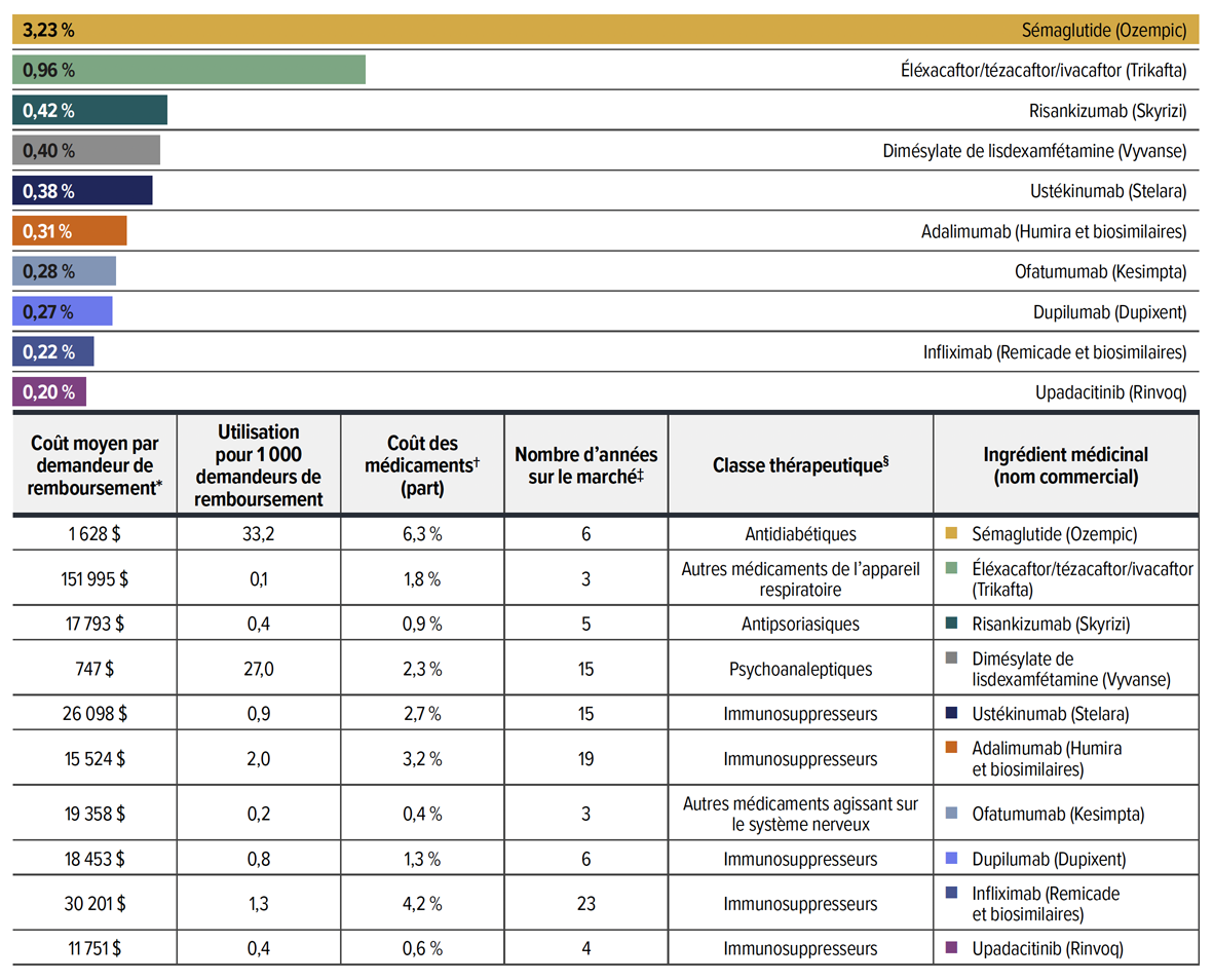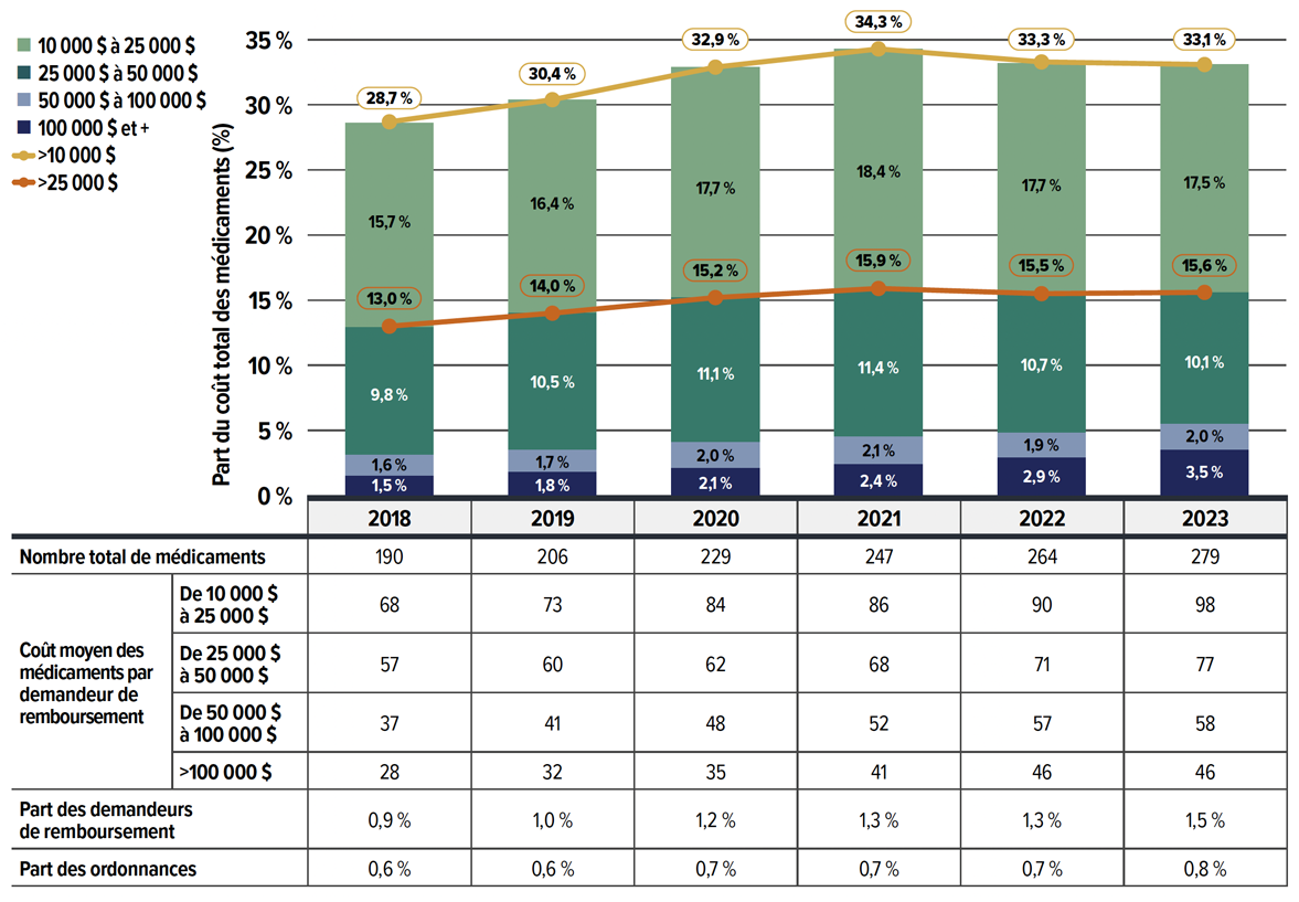 - En 2023, les médicaments coûtant plus de 10 000 $ et 25 000 $ par an représentaient respectivement un tiers et un sixième des coûts de médicaments totaux. Bien qu’un nombre croissant de ces médicaments onéreux aient été remboursés par des régimes privés, ils n’ont été utilisés que par 1,5 % et 0,4 % des demandeurs, respectivement. Notamment, les coûts de 5 % des principaux médicaments onéreux réclamés par les demandeurs de remboursement représentaient près des deux tiers des coûts de médicaments totaux dans les régimes privés.