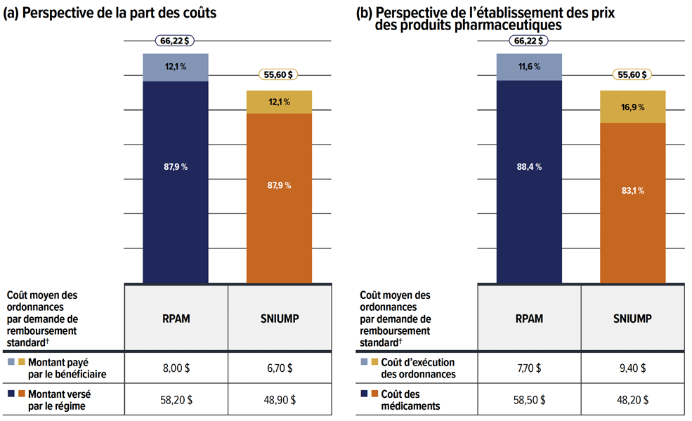 Les régimes privés d’assurance-médicaments remboursent généralement les médicaments prescrits selon un nombre de jours d’approvisionnement plus élevé par rapport à celui prévu par les régimes publics du SNIUMP. Le nombre de demandes de remboursement et les coûts engagés sont donc moindres. Toutefois, les demandeurs de remboursement paient des coûts plus élevés que les bénéficiaires actifs des régimes publics.