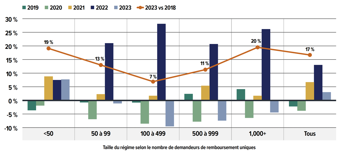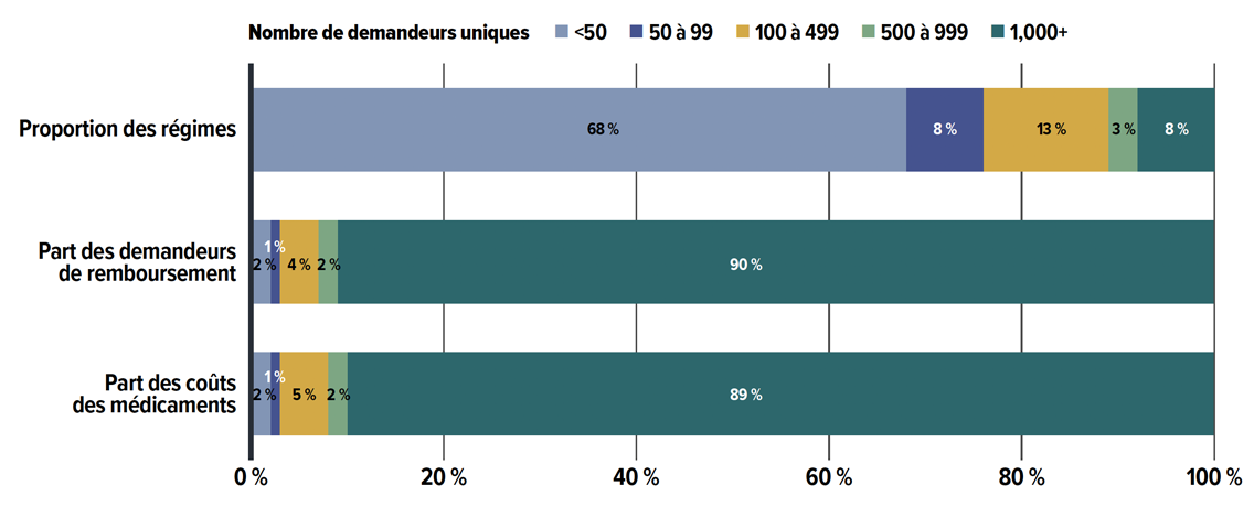 Sans entrer dans les détails des structures de couverture, des primes ou d’autres frais d’assurance comme que les frais de regroupement, ces variations en fonction de la taille du régime portent à croire que les promoteurs de régimes de petite taille peuvent offrir une couverture moins complète pour gérer les coûts en raison de leur groupement d’assureurs de plus petite taille. À l’inverse, les grands régimes, dont les profils de patients sont plus diversifiés, peuvent mieux répartir les coûts par demandeur sur une base plus large, même s’ils couvrent un plus grand nombre de médicaments onéreux. Les régimes de taille moyenne ne bénéficient pas de l’avantage de regroupement des grands régimes, mais offrent également une couverture plus large que celle des régimes plus petits, ce qui peut se traduire par des coûts plus élevés par demandeur.