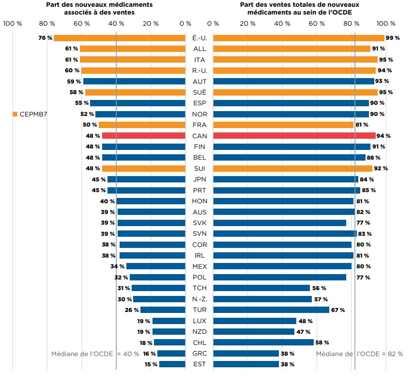 - De 2009 à 2017, près de la moitié (48 %) de tous les nouveaux médicaments ont été vendus au Canada; le Canada se situe ainsi devant la médiane de l’OCDE (40 %), mais derrière la plupart des pays du CEPMB7, où les prix moyens des médicaments brevetés sont généralement plus faibles.