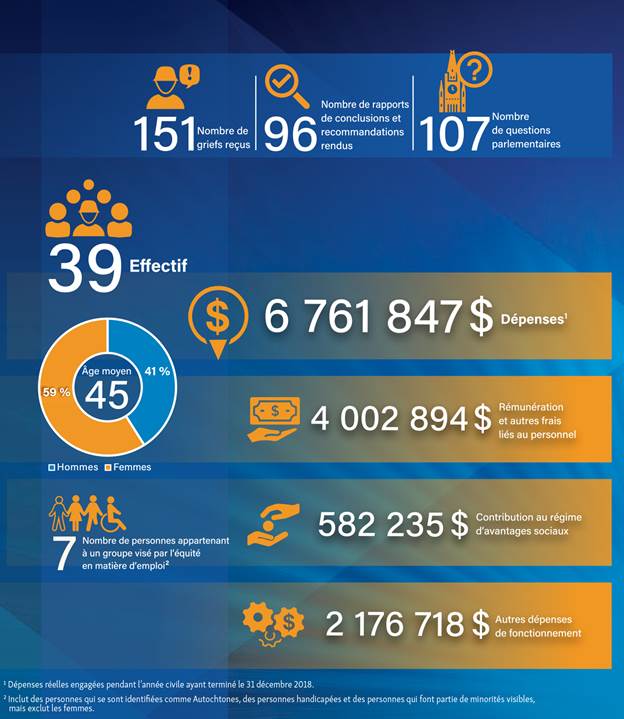 Le départ de nombreux agents de griefs expérimentés, l’attente de la nomination de nouveaux membres ainsi que la période d’apprentissage des membres du Comité récemment nommés ont fait en sorte que le nombre d’examens de griefs que nous avons complétés en 2018 est moins élevé que celui des années précédentes. Il s’agit d’une situation temporaire qui devrait être résolue en 2019. Malgré tout, la grande qualité de nos examens demeure inchangée. Cette ligne de conduite demeure notre point de mire. Elle reste invariable même dans un contexte de grand changement.