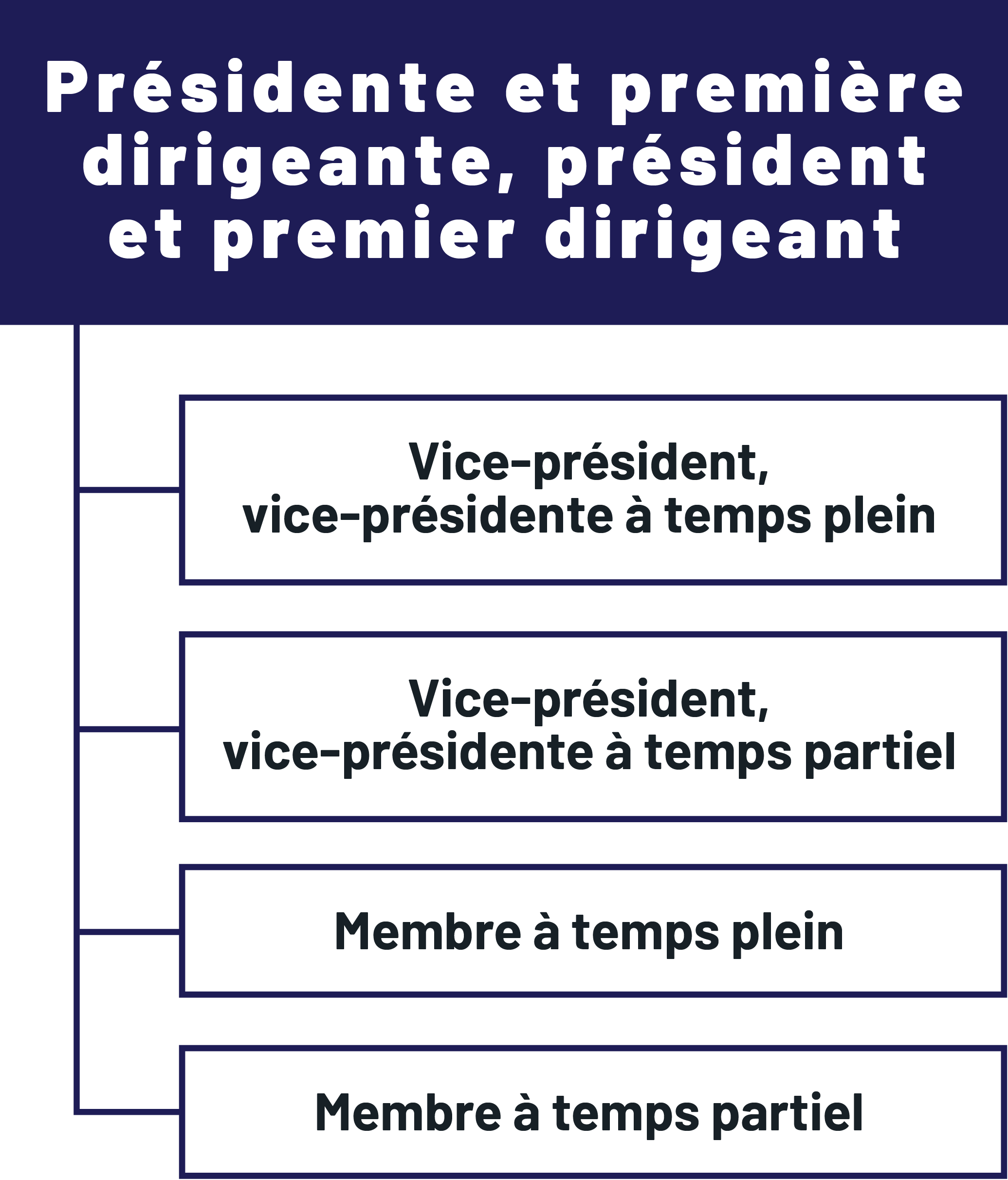 En vertu de la LDN, le gouverneur en conseil doit nommer une présidente ou un président à temps plein et au moins deux vice-présidents ou vice-présidentes. Il peut aussi nommer d’autres membres du Comité, selon les besoins de l’organisation. Les membres du Comité sont nommés pour une période maximale de quatre ans avec possibilité de renouvellement.