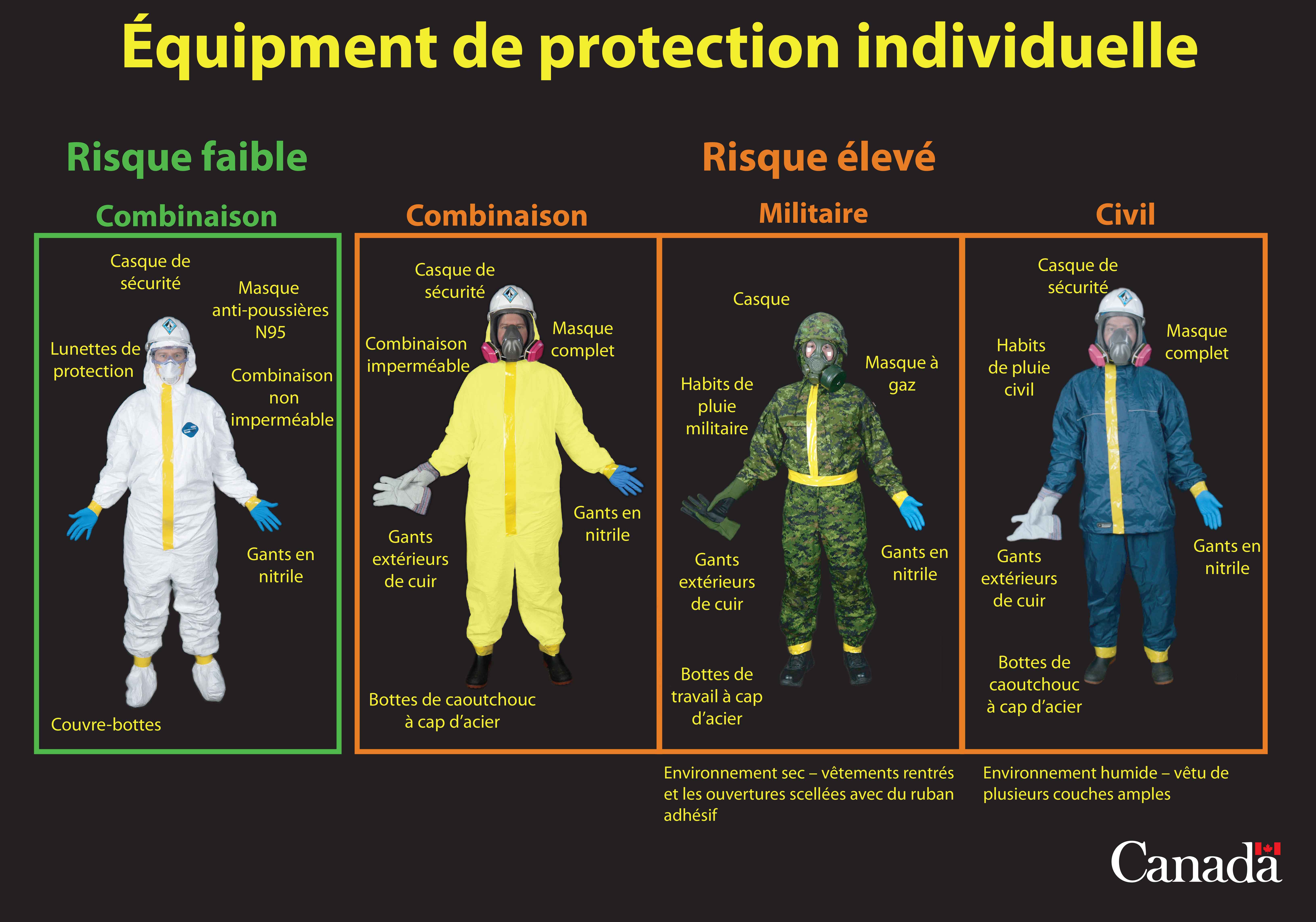 - habits de pluie (scellés), masque à gaz, casque, gants en nitrile avec gants extérieurs de cuir, bottes de travail à cap d’acier