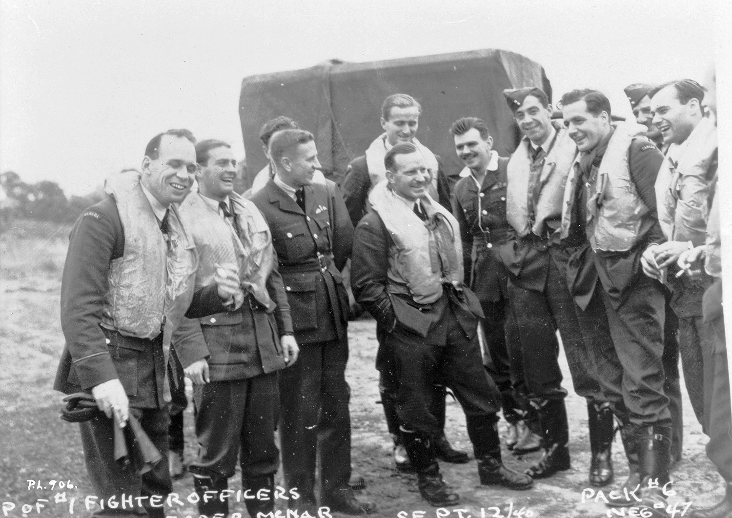 « Lors de la première sortie des aéronefs de l’Escadre à Northolt, les aéronefs des trois escadrons postés sur cette base – le 303e Escadron polonais, le 1er Escadron de la RAF et le 1er Escadron de l’ARC – étaient alignés prêts pour le décollage dans leurs aires de dispersion respectives situées dans trois différentes zones du terrain. En raison d’une confusion dans les ordres de décollage, les trois escadrons ont ouvert les gaz en même temps pour se diriger vers le centre du terrain où les trente-six aéronefs se sont rencontrés!