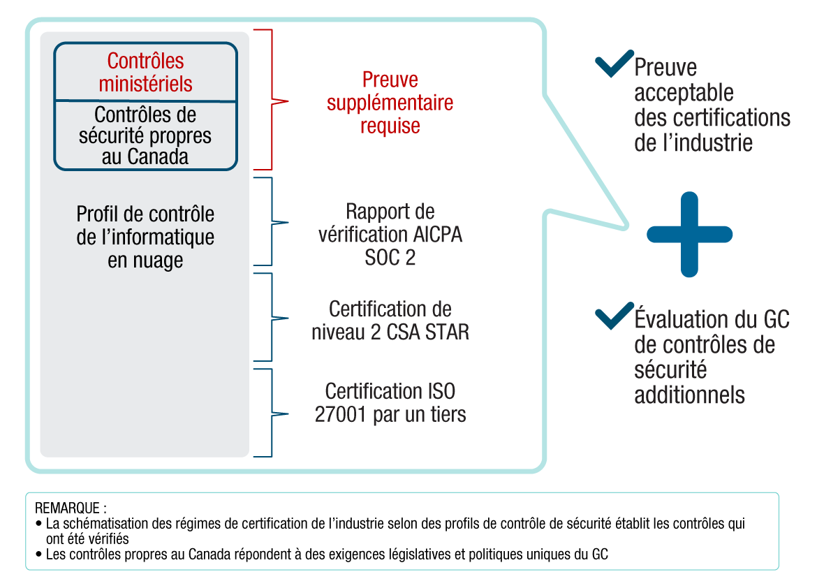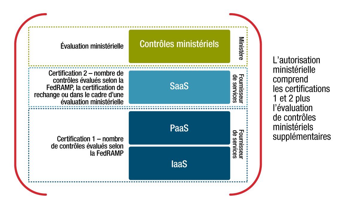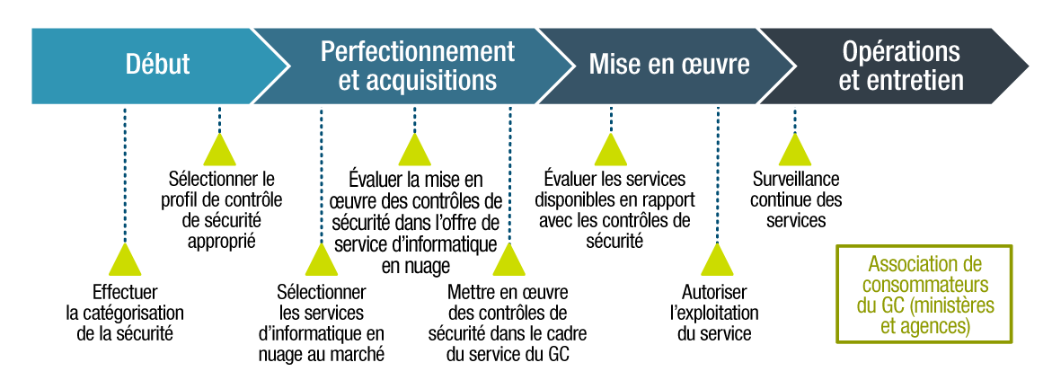 Cette approche et les procédures sous-jacentes aident à faire en sorte que les fournisseurs de services d’informatique en nuage (FSI) comprennent les exigences de sécurité du GC, et que les ministères et organismes du GC (ou les organisations consommatrices du GC) et les FSI comprennent leur responsabilité partagée dans la mise en place de mesures de sécurité assez rigoureuses pour permettre l’hébergement des services du GC et de l’information connexe dans divers environnements de nuage.