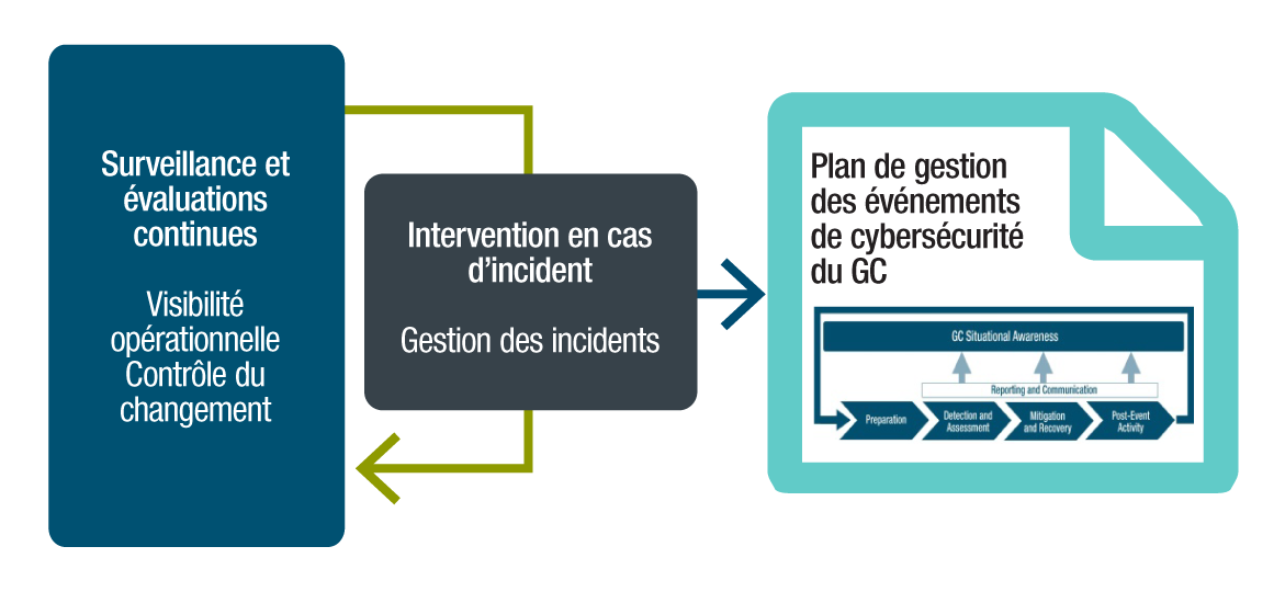 Le GC doit continuer d’être en mesure d’intervenir rapidement et de manière cohérente et concertée en cas d’événement de cybersécurité dans l’ensemble du GC. La surveillance continue et l’évaluation de la sécurité sont des processus essentiels qui aident les organisations consommatrices du GC à mener leurs activités de détection et d’intervention à bien et en temps opportun en cas d’attaques, d’atteintes à la sécurité et d’autres événements et changements potentiellement compromettants à l’intérieur ou à l’extérieur de l’environnement du système d’information. La surveillance continue et l’évaluation de la sécurité informent la fonction de sécurité du système d’information qu’il convient d’entreprendre des changements de nature corrective dans le cadre de processus de gestion des incidents, de gestion du changement et d’autres processus.