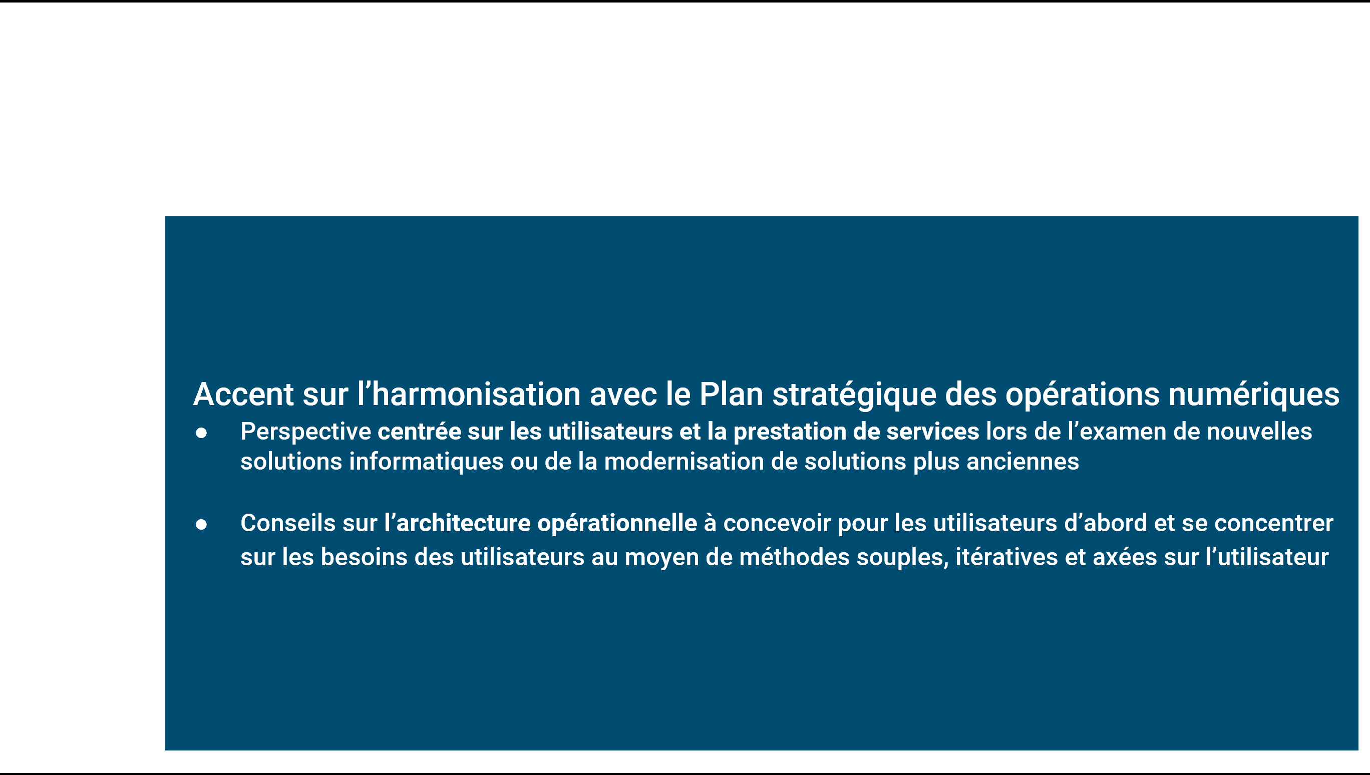 L’architecture intégrée cible des services et du numérique fournit un cadre et un point focal pour prendre des décisions éclairées sur l’harmonisation des solutions opérationnelles en fonction des besoins du GC.