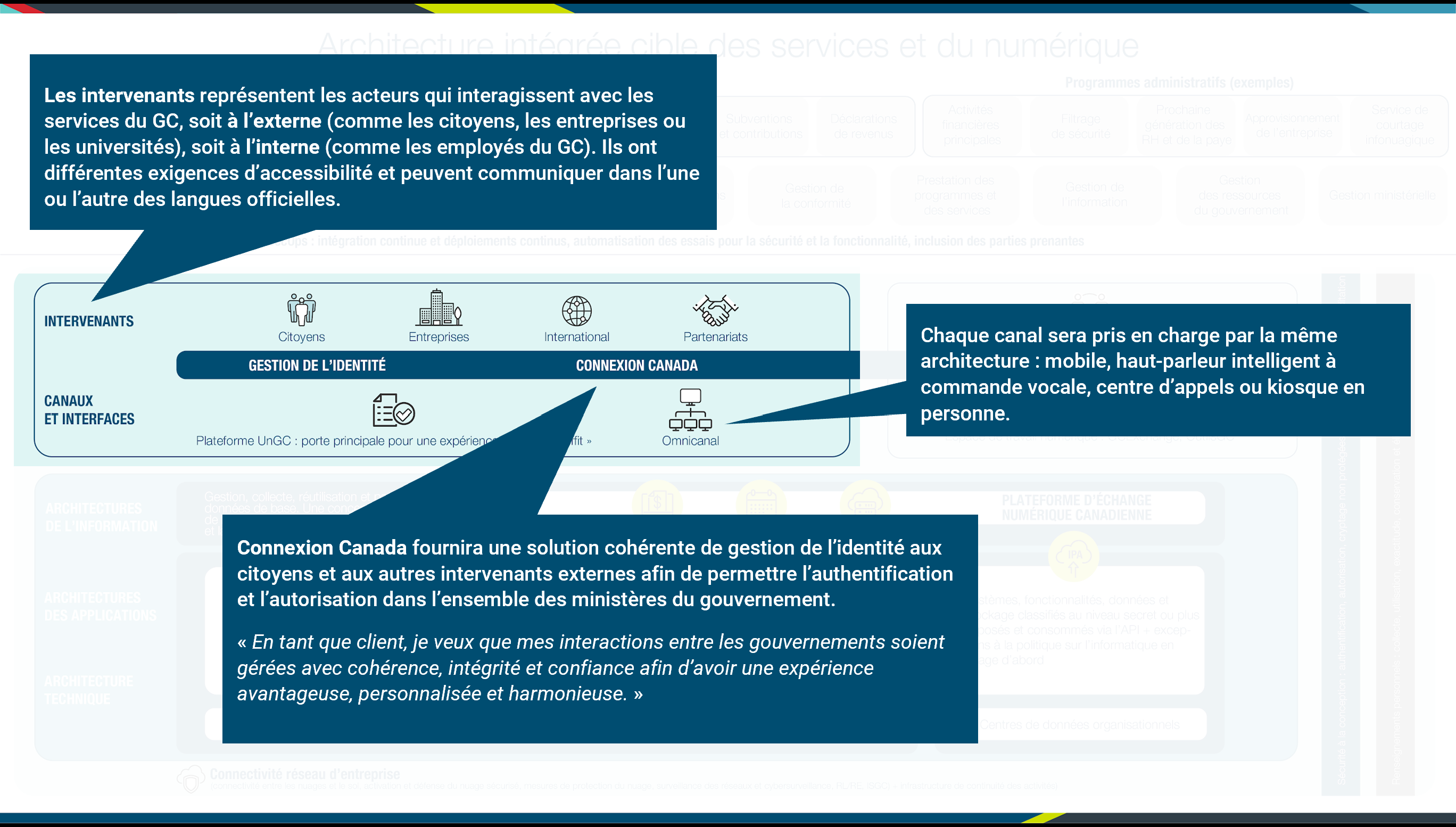 Dans la couche suivante, les intervenants représentent les participants qui interagissent avec les services du GC, soit à l’externe (comme les citoyens, les entreprises, les organisations avec lesquelles le GC est en partenariat, comme les universités ou les acteurs internationaux), soit à l’interne (comme les employés du GC, les délégués, ou les représentants élus). Ils ont différents besoins en matière d’accès (utilisation de mobiles, de haut-parleurs intelligents à commande vocale, de centres de contact et de kiosques) et d’accessibilité, et peuvent communiquer dans l’une ou l’autre des langues officielles. Connexion Canada fournira une solution cohérente de gestion de l’identité aux citoyens et aux autres intervenants externes pour permettre l’authentification et l’autorisation dans tous les ministères du GC.