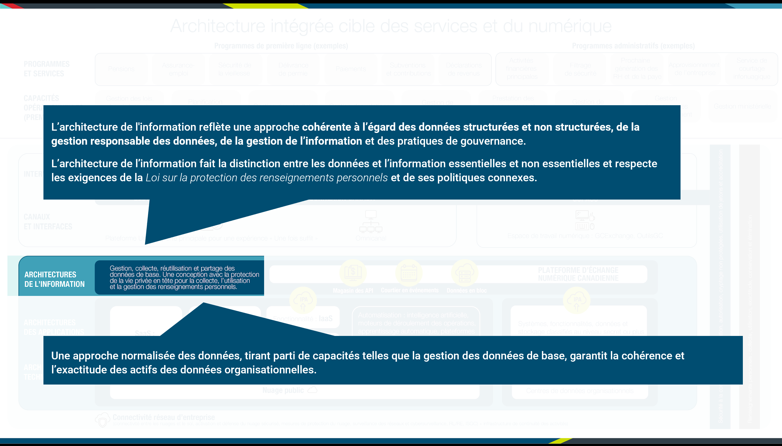 La couche suivante illustre l’architecture de l’information, dont les pratiques exemplaires et les principes visent à soutenir les besoins de l’orientation des services opérationnels et des capacités opérationnelles. Afin de faciliter le partage efficace des données et de l’information à l’échelle du gouvernement, les architectures d’information devraient être conçues de manière à tenir compte d’une approche cohérente de la gestion des données, comme l’adoption de normes fédérales et internationales. L’architecture de l’information devrait également refléter une gestion des données et de l’information et des pratiques de gouvernance responsables, notamment la source, la qualité, l’interopérabilité et les obligations juridiques et stratégiques connexes liées aux actifs de données.