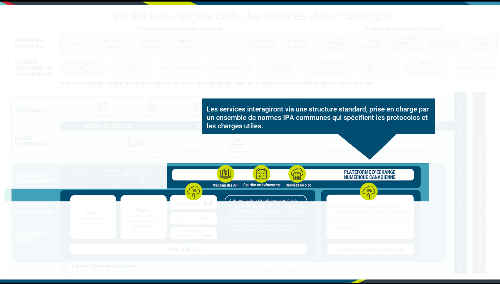 L’architecture intégrée cible des services et du numérique définit un modèle pour l’habilitation numérique des services du gouvernement du Canada qui visent à répondre à plusieurs des défis pressants concernant l’écosystème d’entreprise actuel du GC. Elle cherche à abolir le cloisonnement au sein de l’écosystème actuel du GC en demandant aux ministères d’adopter une perspective axée sur l’utilisateur et la prestation de services lorsqu’ils envisagent de nouvelles solutions de TI ou lorsqu’ils modernisent des solutions plus anciennes. Elle préconise une approche pangouvernementale où les TI sont harmonisées avec les services opérationnels et les solutions prennent appui sur des composantes réutilisables mettant en œuvre des capacités opérationnelles qui sont optimisées de manière à réduire la redondance. Cette réutilisation est rendue possible au moyen d’IPA qui sont partagées dans l’ensemble du gouvernement. Cette approche permet au gouvernement de se concentrer sur l’amélioration de sa prestation de services aux Canadiens tout en relevant les défis liés aux anciens systèmes.