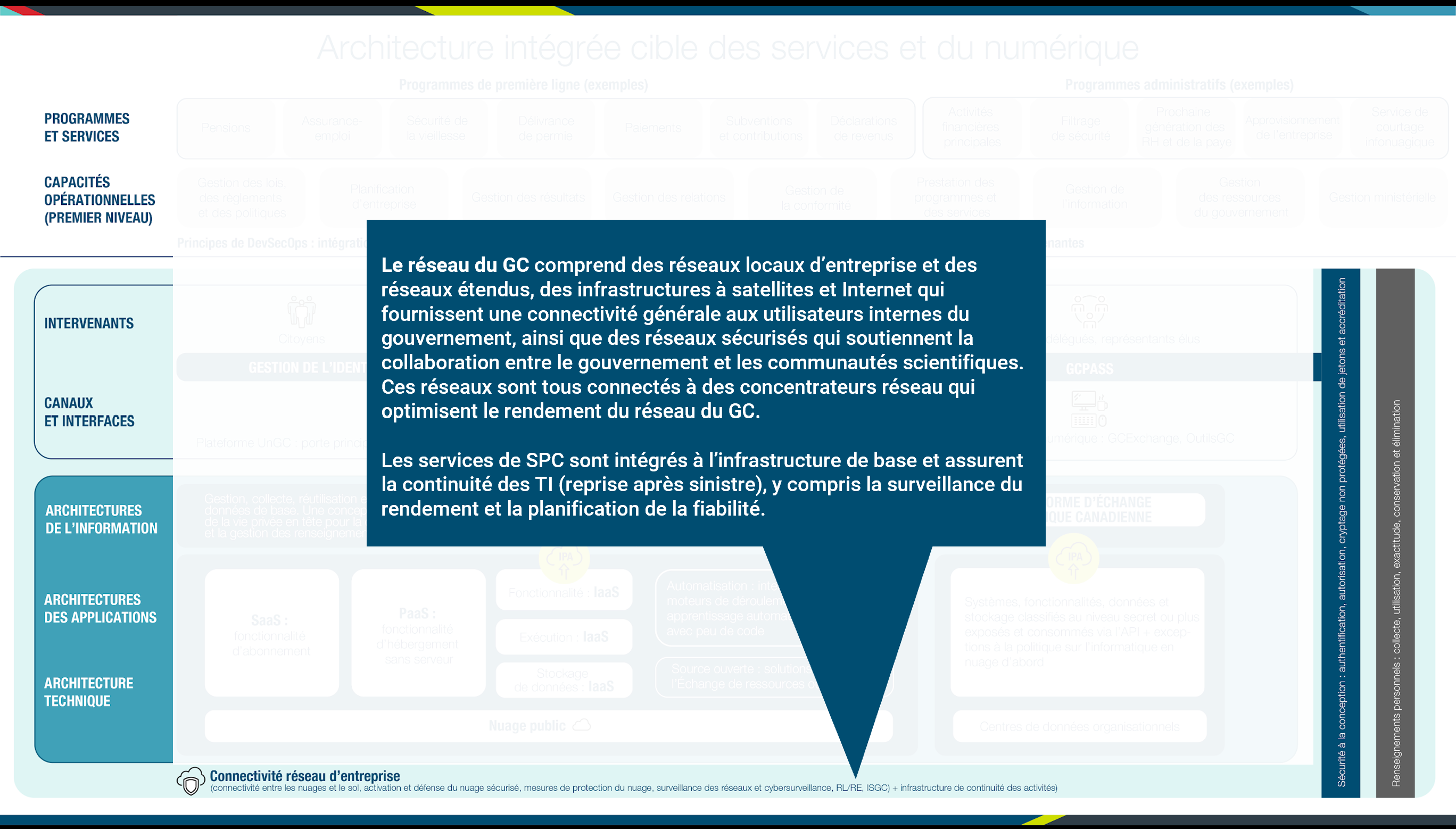 Au niveau inférieur de l’architecture intégrée cible des services et du numérique, l’accent est mis sur l’infrastructure technologique qui sert de ciment pour réunir tous les morceaux : le réseau. Le réseau du GC consiste en un réseau local (LAN), un réseau étendu (WAN), une infrastructure à satellites et Internet qui offre une connectivité générale aux utilisateurs internes du gouvernement, ainsi que des réseaux sécurisés qui soutiennent la collaboration entre le gouvernement et les milieux scientifiques et qui sont tous connectés à des centres de réseau qui optimisent le rendement du réseau du GC. L’infrastructure de base comprend des services de SPC qui assurent la continuité de la TI (récupération en cas de catastrophe), y compris la surveillance du rendement et la planification de la fiabilité.