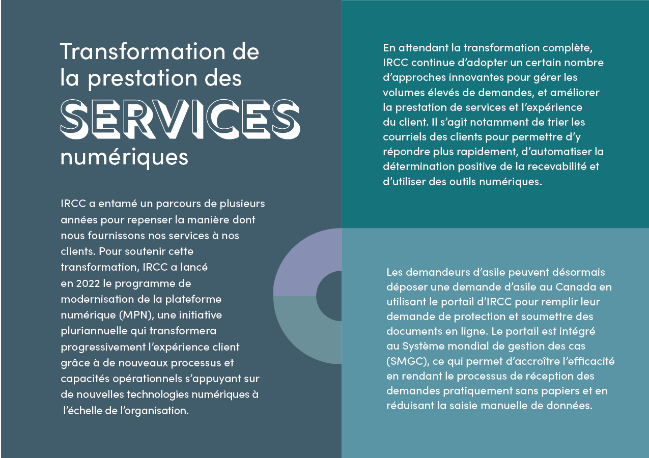 Bien qu’Immigration, Réfugiés et Citoyenneté Canada ait atteint de nombreux objectifs en 2022, notamment l’atteinte des niveaux historiques d’admissions de résidents permanents, il reste des défis à relever. Grâce à la modernisation du Ministère, tel que l’ajout de nouvelles technologies, la rationalisation des processus et l’amélioration de la politique, nous avons réduit les retards dus aux restrictions imposées pendant la pandémie. Le Ministère a mis en place un système de suivi en ligne de l’état d’avancement des dossiers afin de permettre à ses clients d’accéder plus facilement à des informations en temps utile. IRCC continue de renforcer son efficacité, d’améliorer l’expérience de ses clients et de stimuler sa productivité. Tout au long de l’année, nous avons collaboré étroitement avec nos homologues provinciaux, territoriaux et municipaux, ainsi qu’avec ses partenaires en matière de prestation de services, afin de mettre en place un système d’immigration durable et tourné vers l’avenir, qui anticipe les besoins futurs.