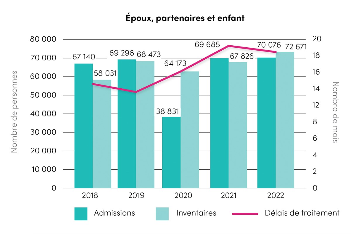 | Réfugiés et personnes protégées au Canada – Partenaires et personnes à charge | 12 629 | 1 375 | 751 | 21 291 | 3 146 | 39 192 |