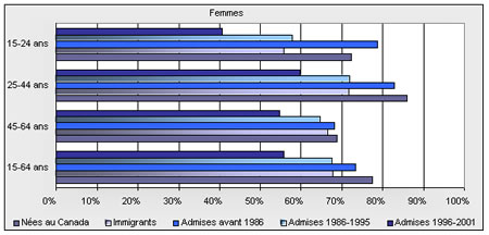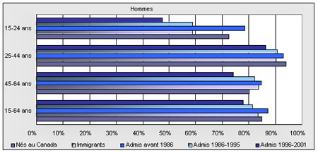 Le taux d’activité a augmenté pour la plupart des cohortes entre le recensement de 1996 et celui de 2001. Les groupes d’âge aux deux extrémités du spectre ont affiché des gains supérieurs à ceux du groupe d’âge moyen. Les femmes et les hommes âgés de 45 à 64 ans qui ont obtenu très récemment le droit d’établissement ont vu leur taux d’activité augmenter de 11 % et de 10 % respectivement.