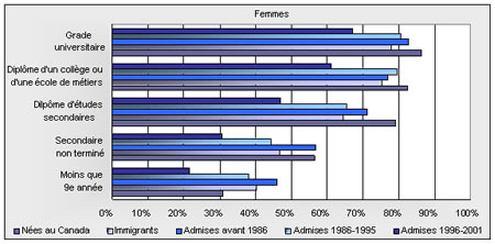 Les emplois des hommes qui ont immigré récemment exigent un niveau de compétence beaucoup plus élevé que ceux des hommes nés au Canada. Moins de la moitié des emplois occupés par des hommes nés au Canada exigent le niveau de compétence le plus élevé : des études universitaires. Chez les hommes qui ont été admis après 1995, presque deux tiers des emplois requièrent des études universitaires. Les femmes qui ont immigré très récemment se classent derrière les femmes nées au Canada en ce qui a trait aux exigences professionnelles de leur emploi. Les immigrants qui ont été admis entre 1986 et 1995 détiennent des emplois qui, de façon générale, requièrent un niveau de compétence moins élevé que les emplois détenus par les immigrants très récents.