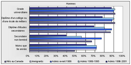 En règle générale, la proportion des personnes actives est directement proportionnelle à leur niveau de scolarité. Cette observation s’applique aux personnes nées au Canada ainsi qu’aux trois cohortes d’immigrants. Il y a toutefois une exception : les hommes qui ont immigré après 1985 et qui, au moment du recensement de 2001, n’avaient fréquenté que l’école primaire affichaient un taux d’activité plus élevé que les personnes ayant entrepris des études secondaires sans les terminer.