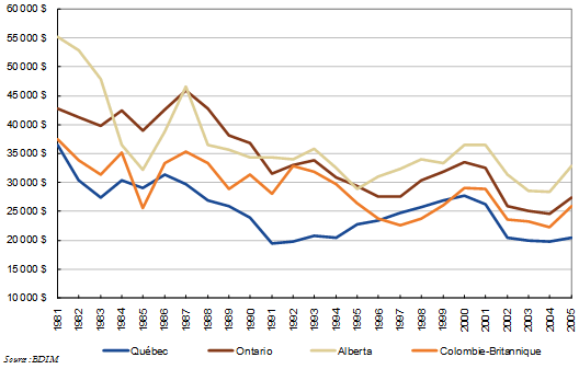 - Les revenus initiaux moyens des immigrants résidant au Québec avaient du retard par rapport à la croissance observée au Canada et dans les autres régions du pays.