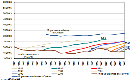 2 Dans la littérature, on entend par revenus initiaux (ADA=1) les revenus annuels réels des immigrants ajustés en fonction de l’IPC, pendant la première année complète après leur admission au Canada (p. ex. Green et Worswick 2004, Aydemir et Skuterud 2004, Frenette et Morissette 2003, et Grant 1999).