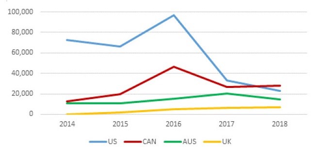 | Canada | 12 959 | 20 022 | 46 319 | 26 976 | 27 809 |