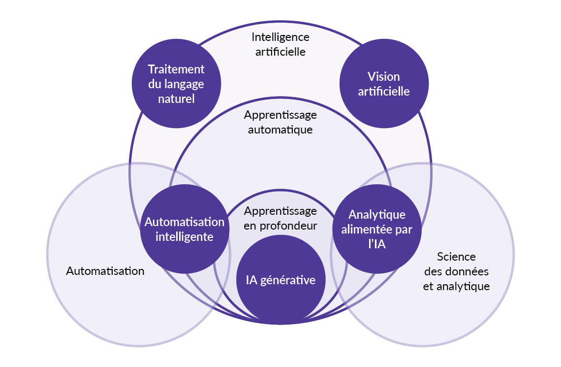 | Automatisation intelligente | Combinaison de technologies d’IA et d’automatisation utilisées pour optimiser des tâches et des processus. Celles-ci imitent souvent une prise de décisions humaines plus exacte et plus rapide. |