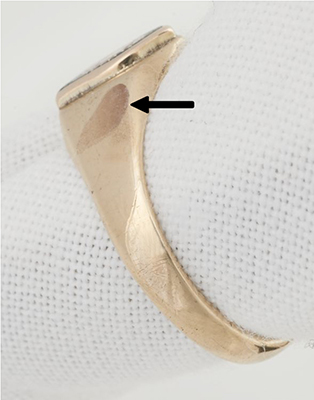 Figure 4. La flèche indique la corrosion laissée sur une bague en or jaune après l'électrolyse.