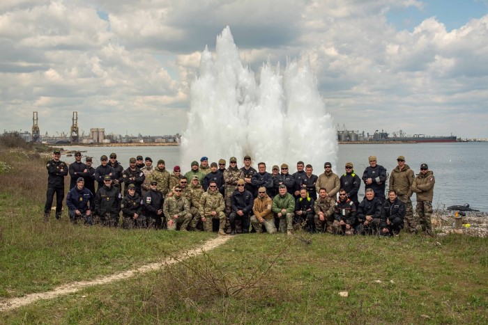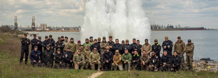 Des plongeurs-démineurs en déploiement pour soutenir la force opérationnelle de LCM de la mer Noire concluent un exercice de destruction avec leurs collègues roumains (Constanta, Roumanie, 2025).