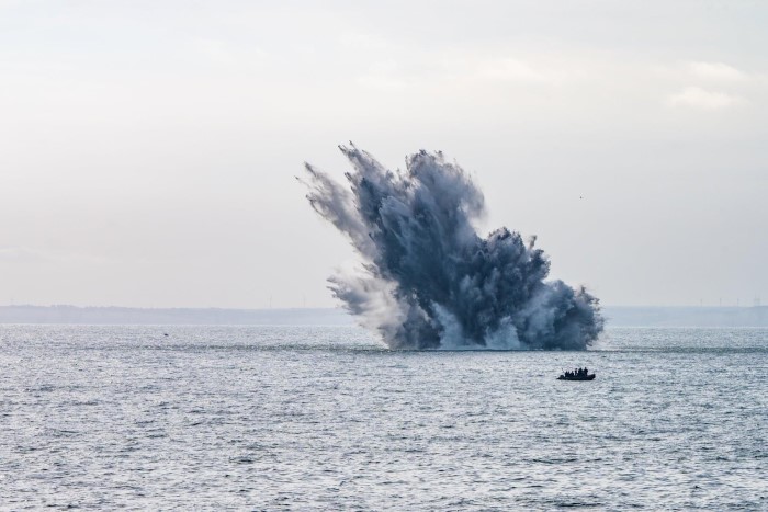 Une mine marine identifiée par des plongeurs-démineurs est détruite par démolition contrôlée lors de l'opération REASSURANCE (Manche, 2022).