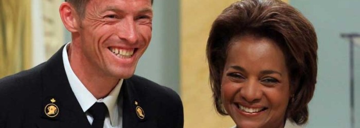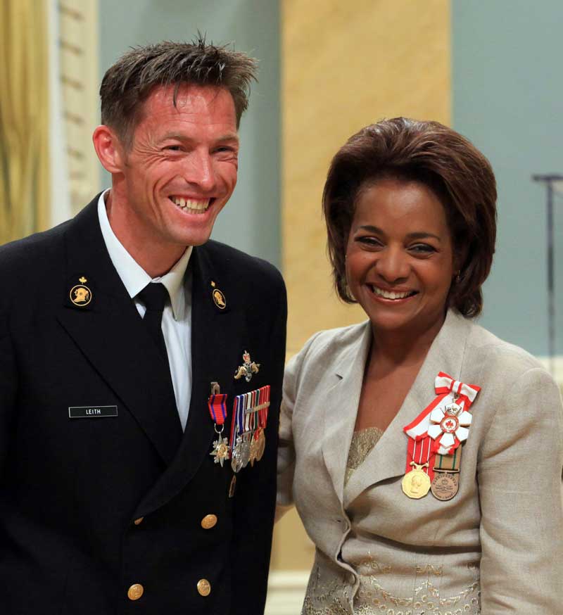 La gouverneure générale Michaelle Jean remet l'Étoile du courage au maître de 2e classe James Leith pour ses actions en tant qu'opérateur de déminage en Afghanistan (Rideau Hall, 2009).