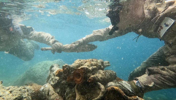 Des plongeurs-démineurs répertorient des munitions non explosées immergées en eaux peu profondes pendant la Seconde Guerre mondiale, dans le cadre de l'opération RENDER SAFE 24-02 (Munda, Îles Salomon, 2024).