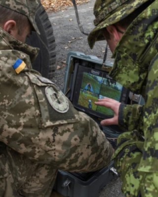Un plongeur-démineur enseigne à un membre des forces armées ukrainiennes l'utilisation d'un véhicule télécommandé lors de l'opération UNIFIER (Kamianets Podilskyi, Ukraine, 2015).