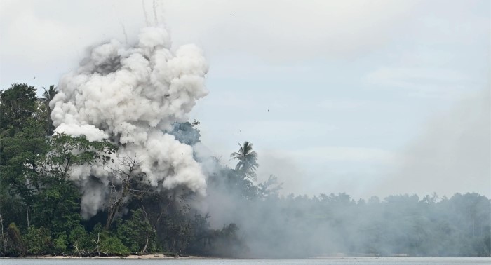 Des munitions non explosées récupérées auprès des communautés locales sont détruites par démolition contrôlée lors de l'opération RENDER SAFE 24-02 (Munda, Îles Salomon, 2024).